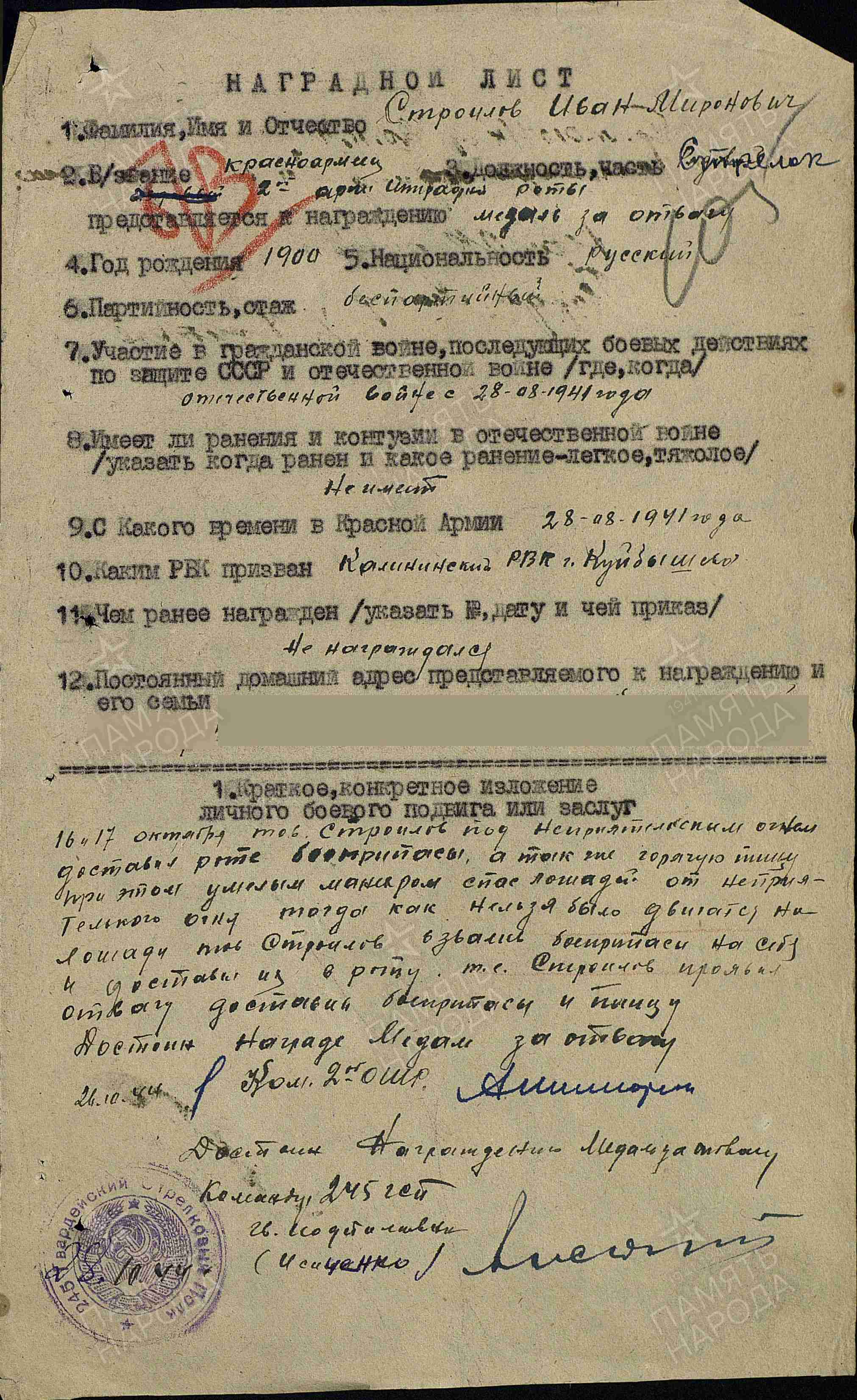 Иван Миронович родился в 1900 году. Участник Великой Отечественной войны, на фронте с 1941 года. Вернулся в 1945 г. Был награжден медалью «За боевые заслуги», медалью «За отвагу» (дважды). Был женат на Строиловой Ефимии Георгиевне (1899 г.р.), у них было три сына. Иван Миронович умер в 1966 г.