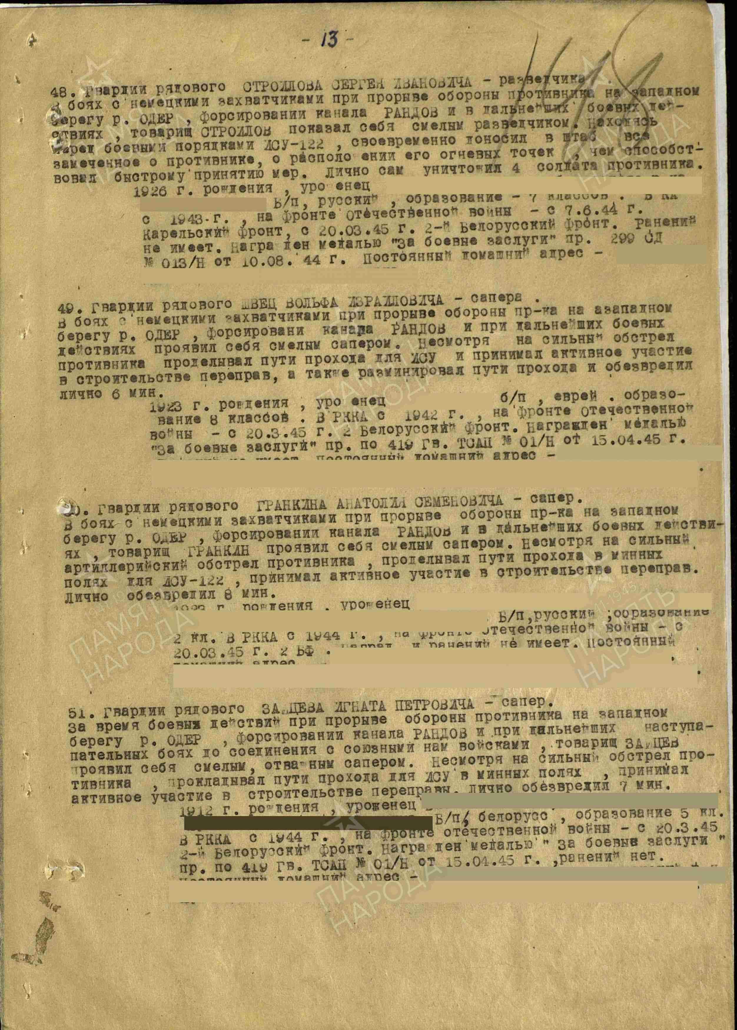 Родился в 1925 году. Участник Великой Отечественной войны. Вернулся в начале 1946 г. Два месяца от него ничего не было слышно, было очень тревожно. Награжден медалями «За боевые заслуги» (1944 г.), «За отвагу» (1945 г.), «За победу над Германией в Великой Отечественной войне 1941–1945 гг.» (1945 г.), орденом Отечественной войны II степени (1985 г.). Женился в 1945 г. Информации больше нет.