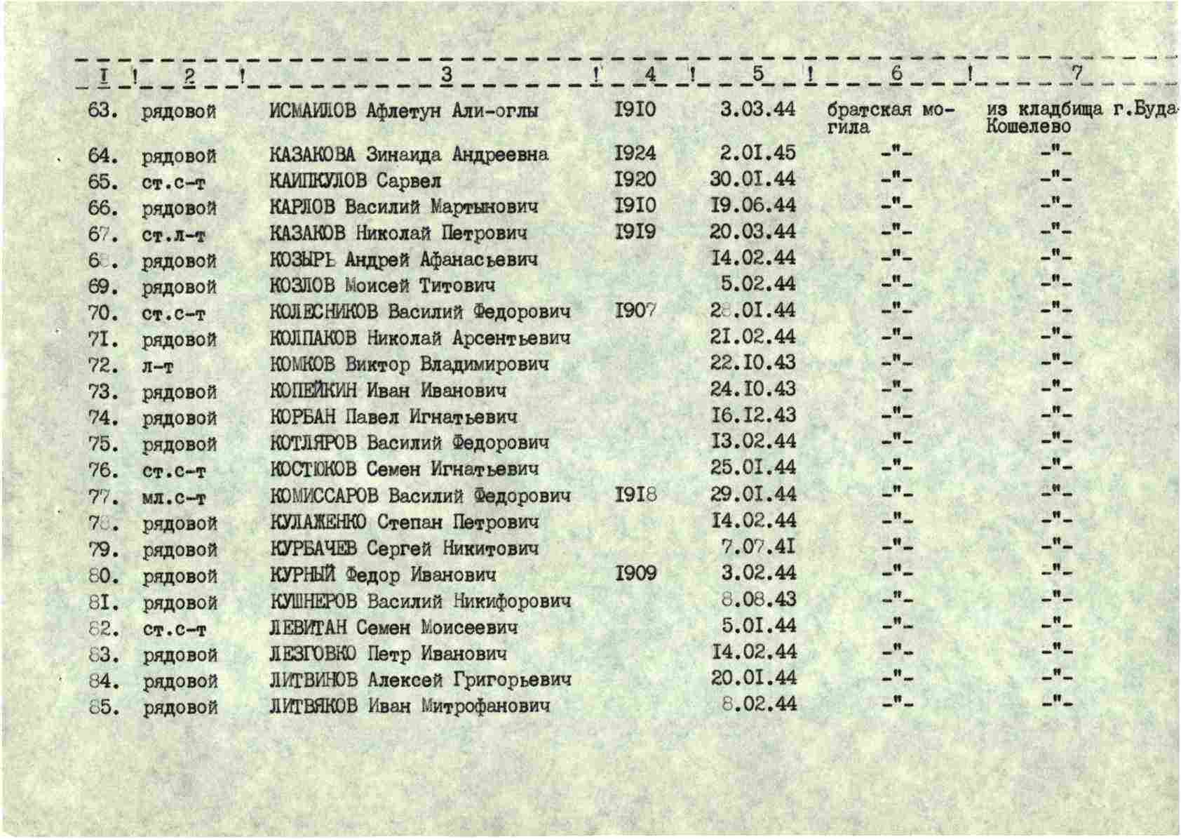 Братская могила советских воинов и партизан в Буда-Кошелево появилась вскоре после Второй мировой войны. Мемориал расположен в центре города. Здесь покоятся останки тех, кто погиб, освобождая Буда-Кошелевский район от немецкий войск (в общей сложности 253 человека, включая генерала-майора Николая Прищепу). В 1960 году была установлена надмогильная плита с известными именами тех, кто погиб (умер от ран). В 1990 году памятник был расширен. Для каждого похороненного установлена стела, на мраморной подставке установлена скульптура воина, вечный огонь. На памятном обелиске высечено имя и нашего земляка, Николая Петровича Казакова.