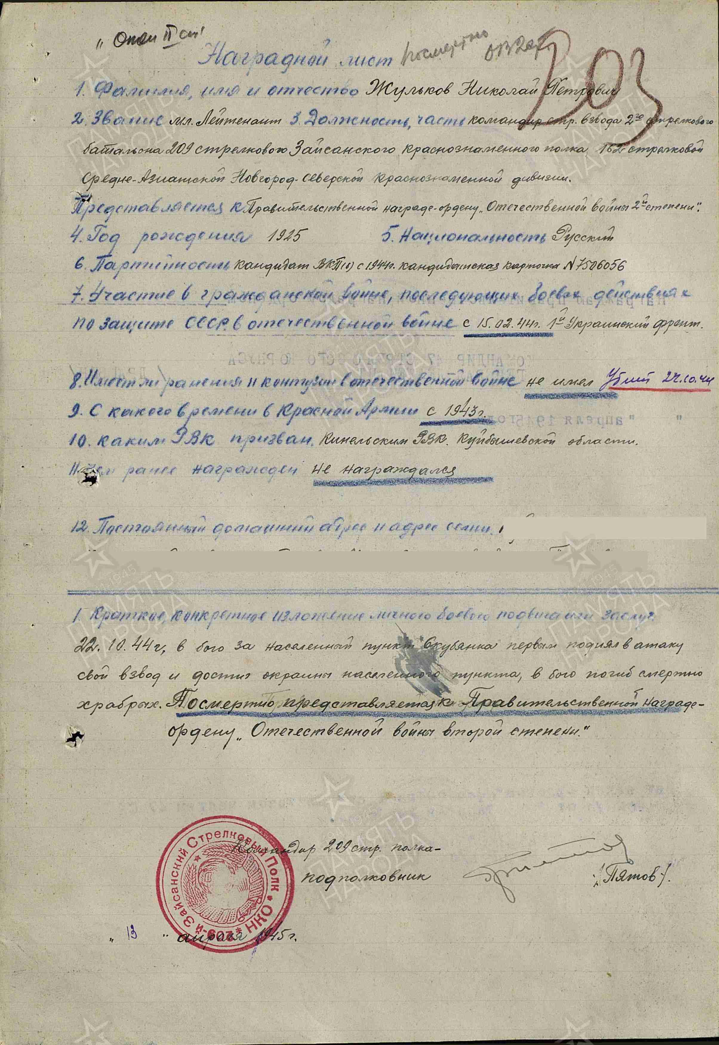 Ушел на фронт в 1943 г. Воинское звание: младший лейтенант. С 15 февраля 1944 г. воевал в составе 1-го Украинского фронта. Последнее место службы 209 сп 162 сд 47 ск. Командир стрелкового взвода, младший лейтенант Николай Жульков погиб смертью храбрых 22 октября 1944 года. Первичное место захоронения Польша, Варшавское воев., пов. Пултуский, п. Загжинск, 200 м, южная окраина Посмертно награжден орденом Отечественной войны II степени.