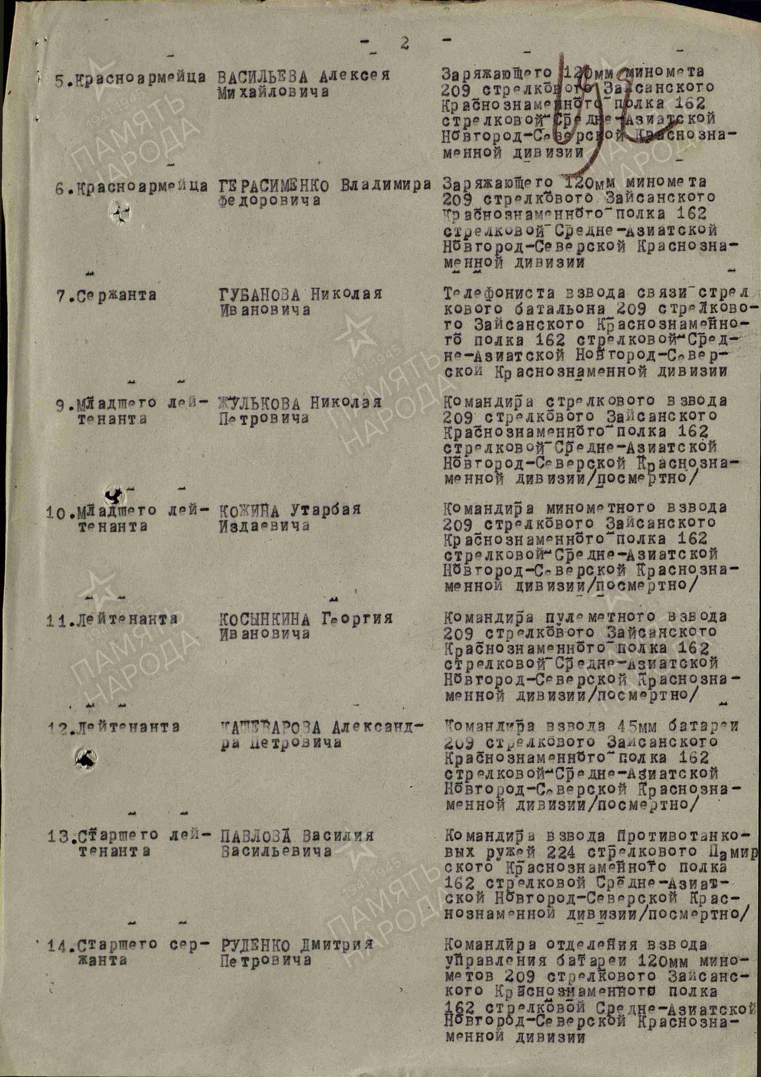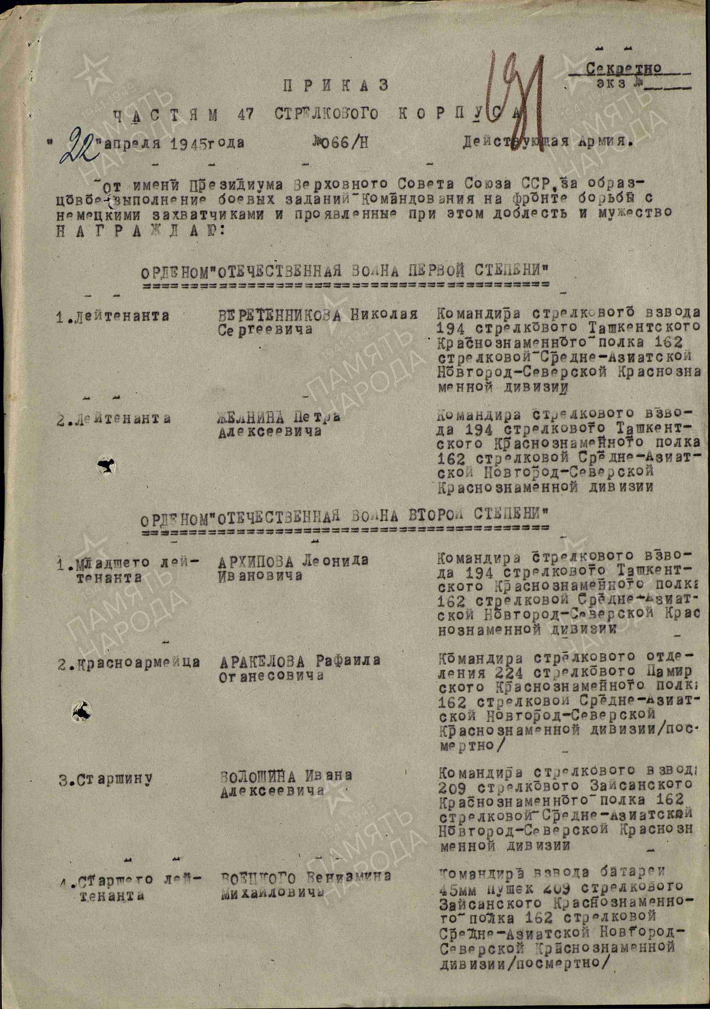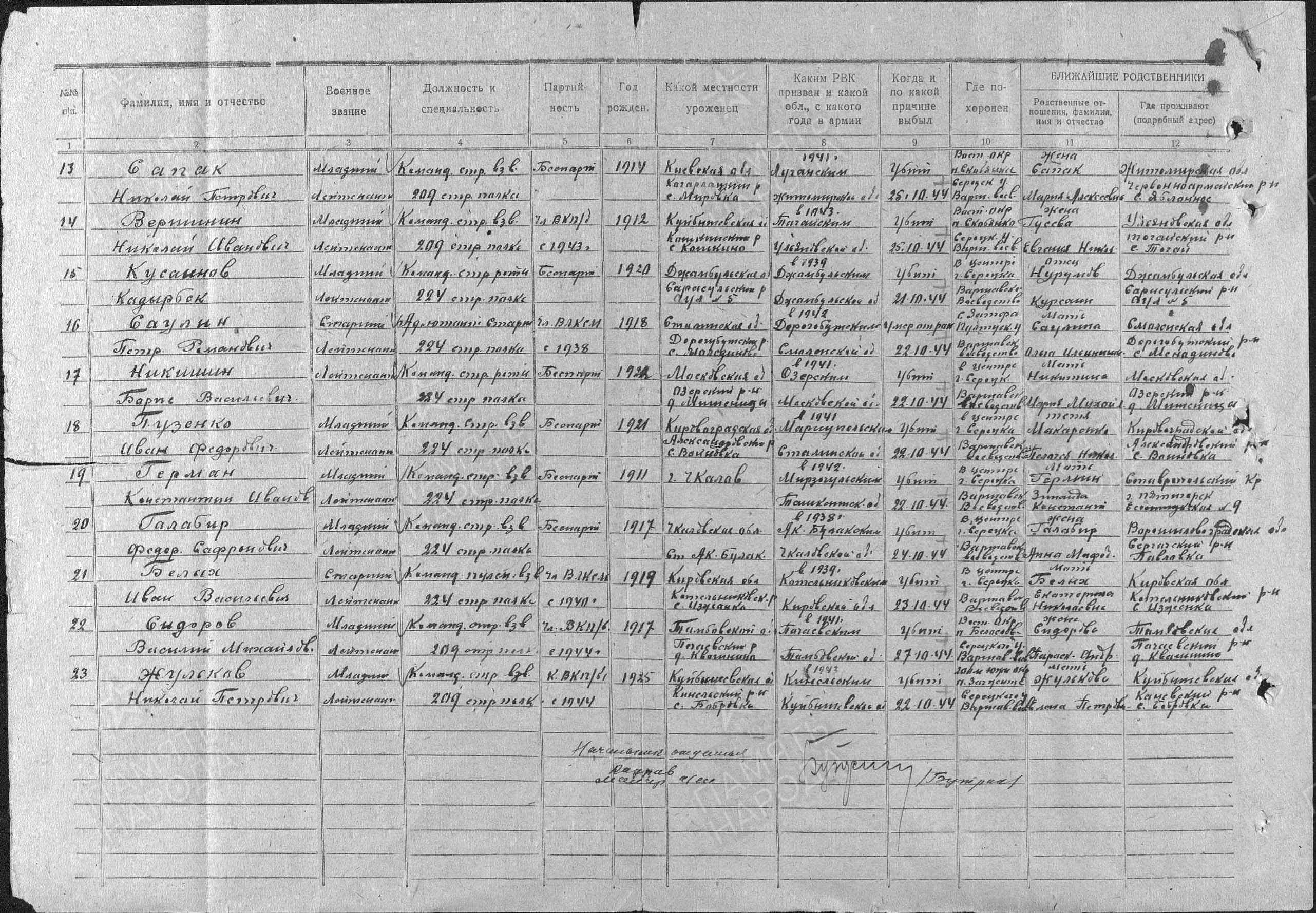 Информация из Наградного листа: «22.10.44 г. в бою за населенный пункт Скубянка первым поднял в атаку свой взвод и достиг окраины населенного пункта, в бою погиб смертью храбрых. Посмертно представляется к Правительственной награде ордену «Отечественной войны II степени».