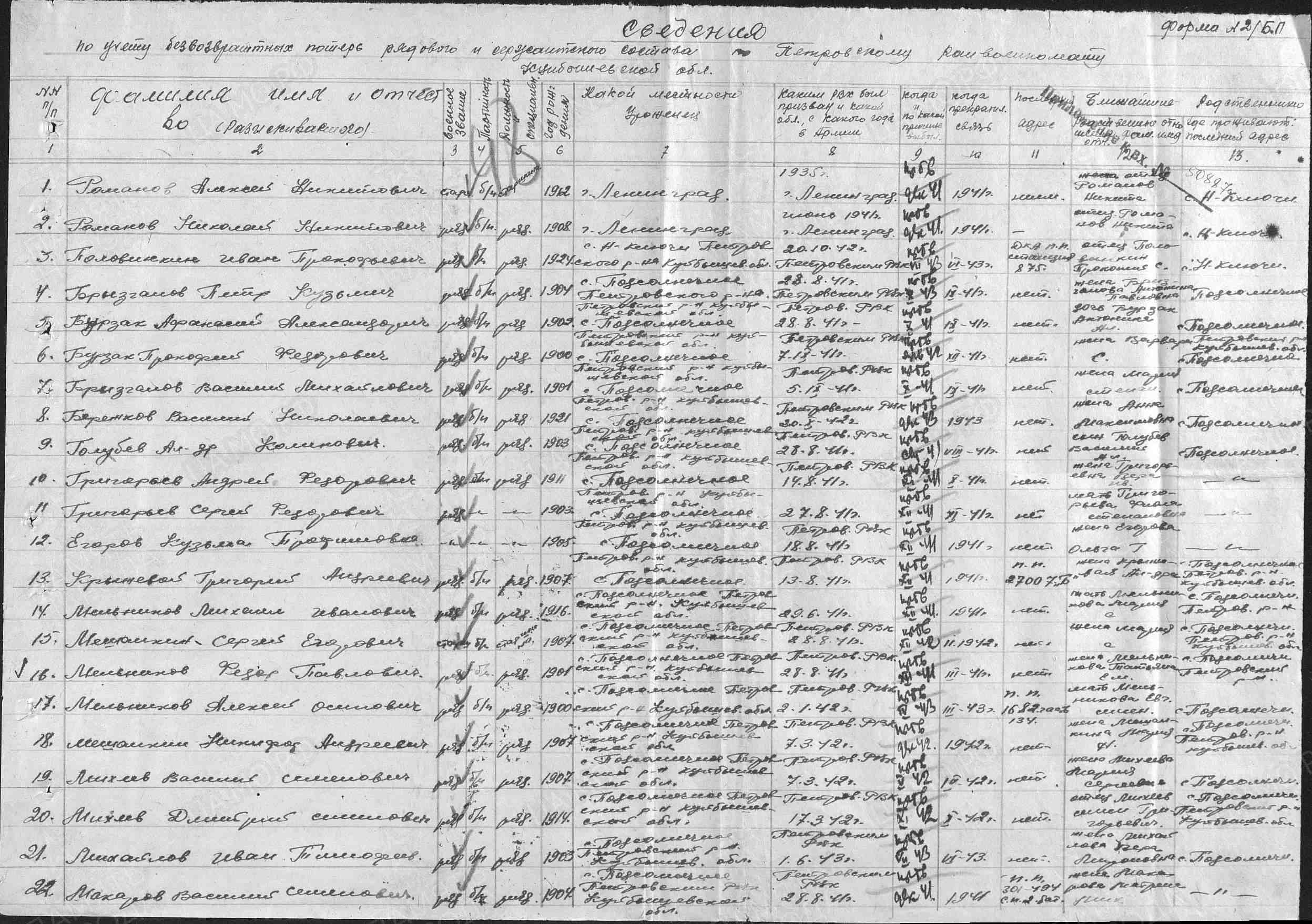 Алексей Мельников родился в с. Петровка Борского района в 1900 г. Воевал на Курской Дуге, там же пропал без вести в апреле 1943 г. (было извещение, к сожалению, оно не сохранилось).
