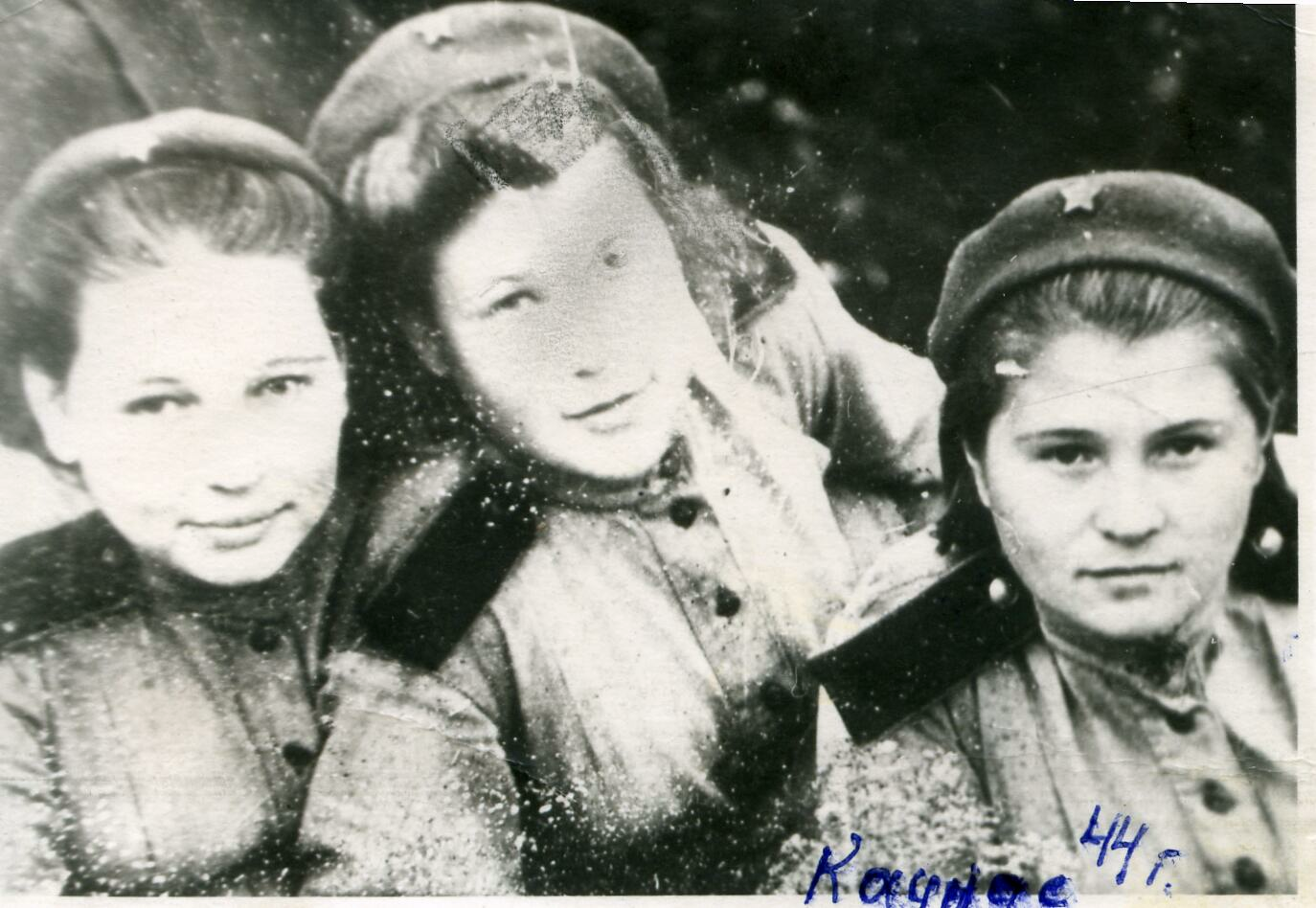 Курсы радисток. В ноябре 1943 года нас с Марусей Мурашкиной, моей лучшей подругой, военкомат послал на курсы радисток в поселок Студенцы Кинельского района. В мае нас, как военнообязанных специалистов, призвали в действующую армию и привезли в город Ярцево Смоленской области, только что освобожденный от фашистов. Здесь организовали запасную часть, где нас стали основательно обучать военному делу и работе на радиостанции. Жили мы в землянках, питались очень плохо: 2 ложки тушеной капусты, 2 сухаря, 4 кусочка сахара и баланда (жидкая похлебка из манной крупы) — из этого состоял весь суточный паек, которым никогда не наедались досыта. Но мы умудрялись еще и фотографироваться, продавая сухари. Письма писали домой на обертке от каш, если не присылали бумаги. Два месяца шло обучение, а потом — переправка в Каунас, и опять нас учили, как исправлять различные поломки на радиостанции, как стрелять из карабина, автомата и т.д.