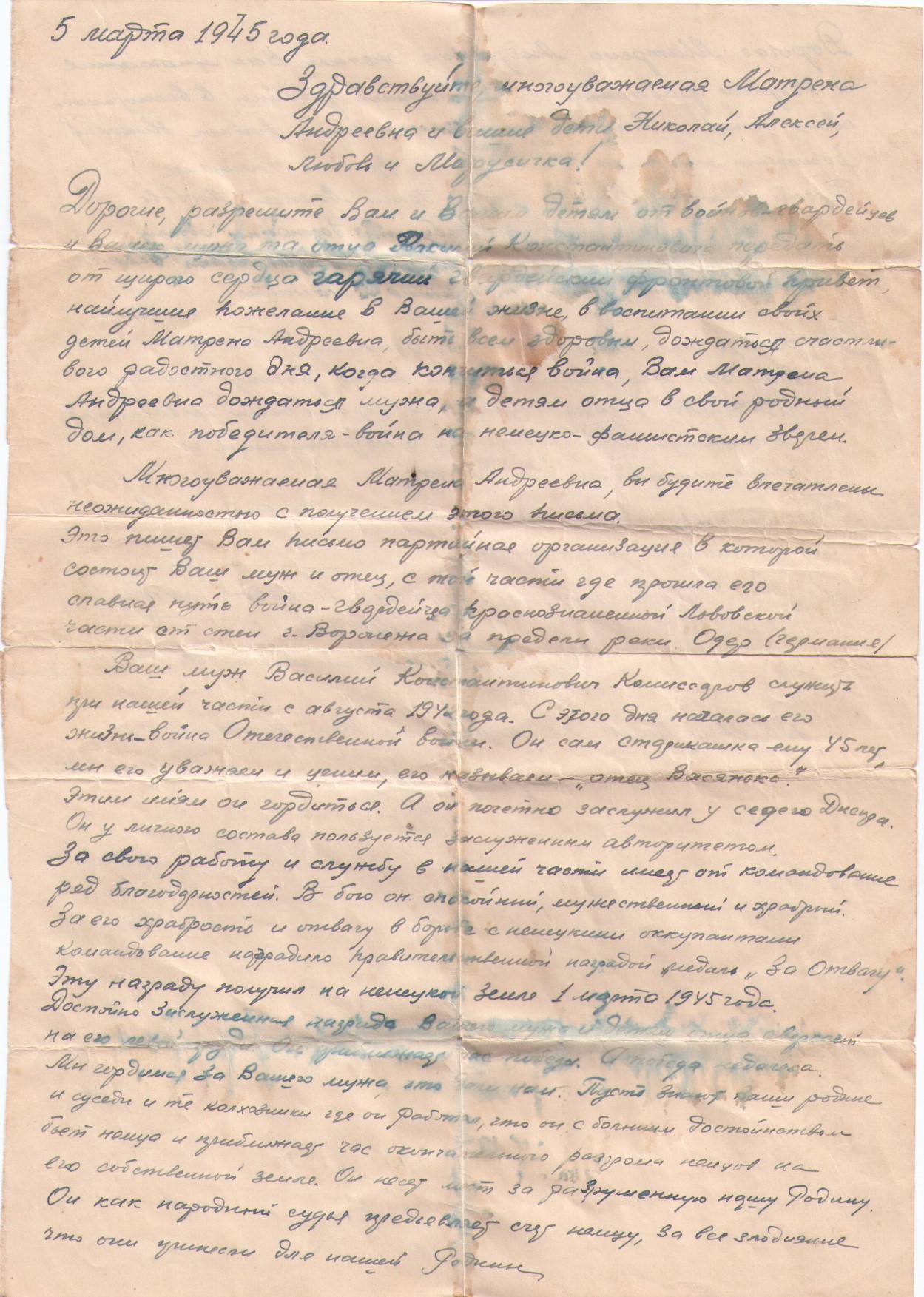 В 1945 году Матрене Андреевне пришло Благодарственное письмо, подписанное парторгом части (полевая почта 78142-Е).