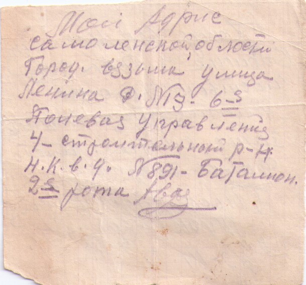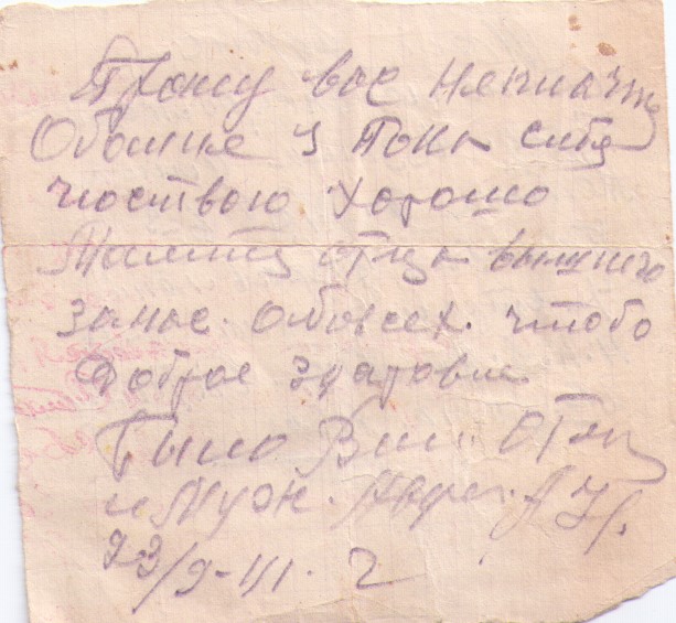 Короткое письмо на двух страничках от 23 сентября 1941 г., адресованное Авдеевым Николаем Александровичем своим родным, передала внучка, Камнева Т.В., п. Комсомольский Кинельского района Самарской области. Информации больше нет.