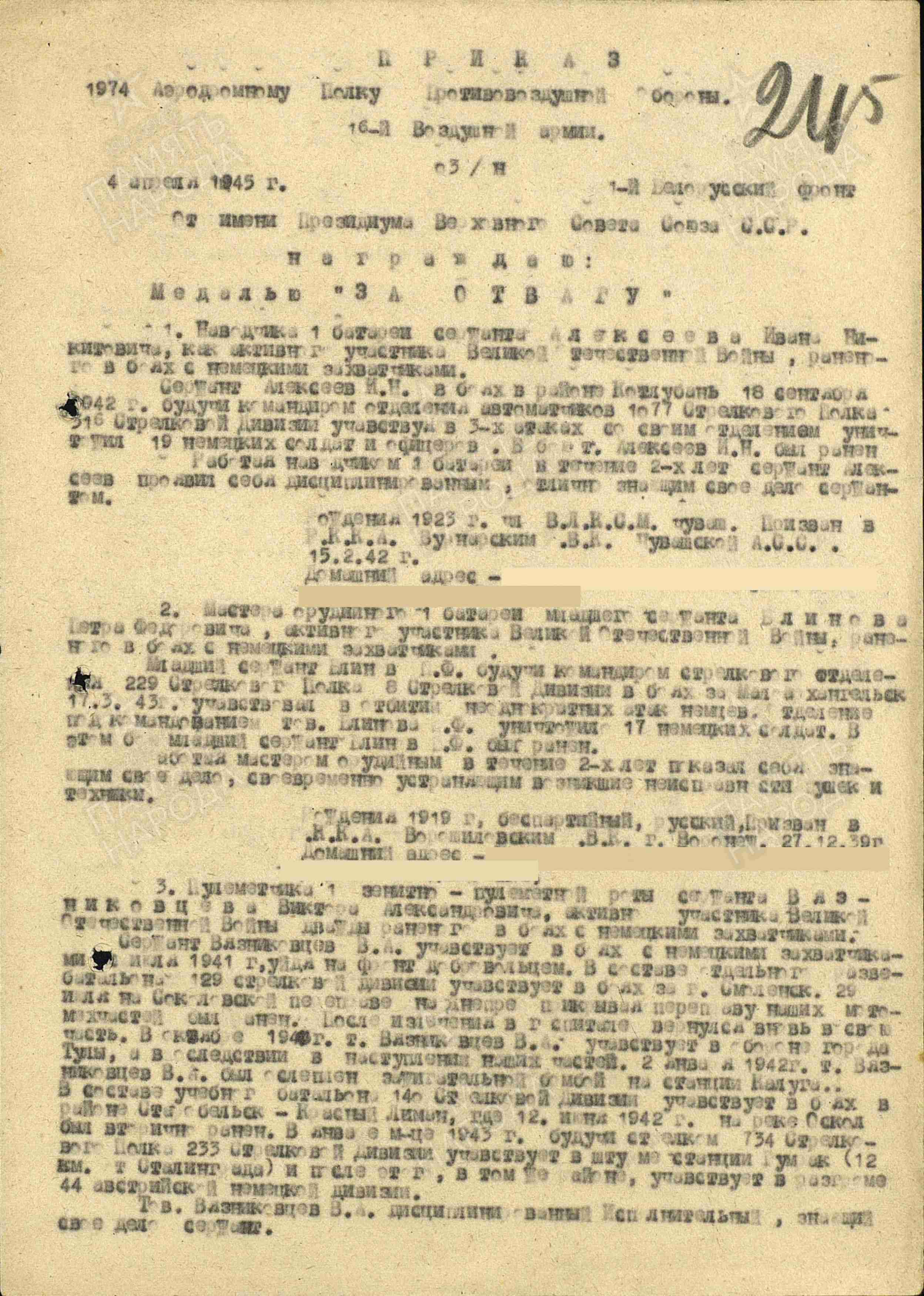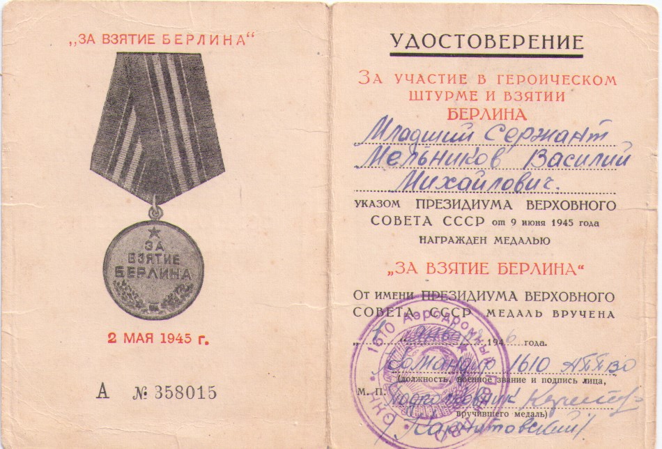 Василий Мельников родился в 1923 году в селе Аделаидовка Шенталинского района. Гражданская специальность до войны – маляр. Призван на военную службу Шенталинским РВК Куйбышевской области в 1942 году. Место службы: 1974 аэр. полк ПВО 16 ВА 1 БелФ. Наводчик 2 зенитно-пулеметной роты, старший сержант.