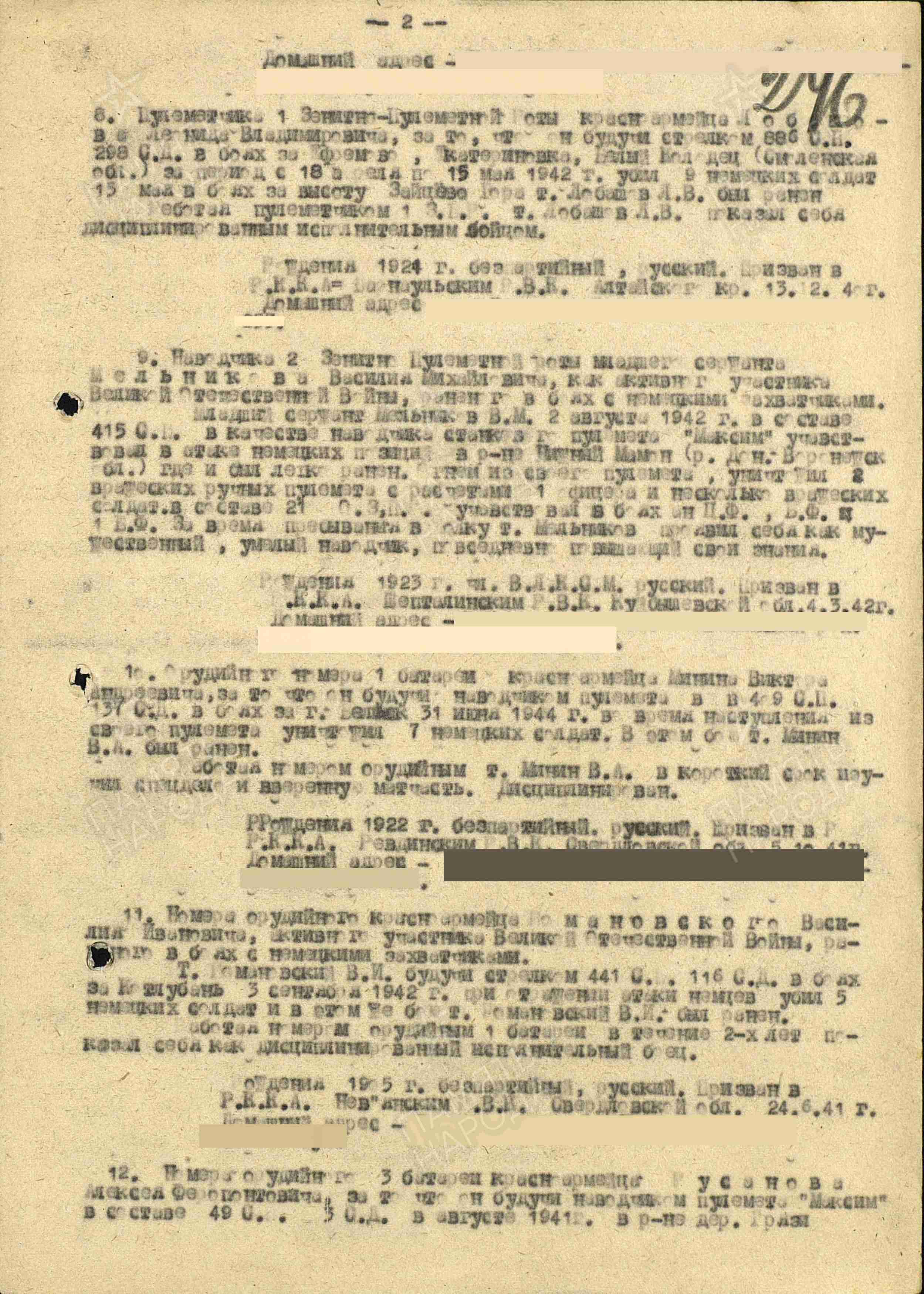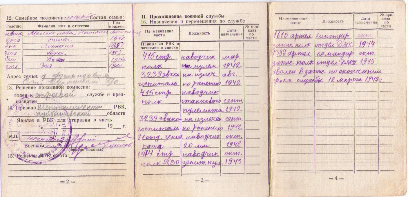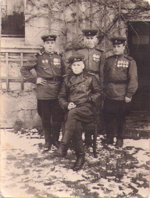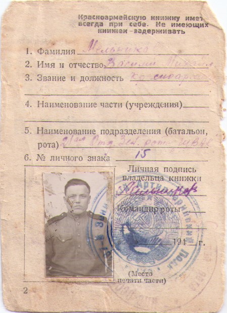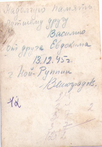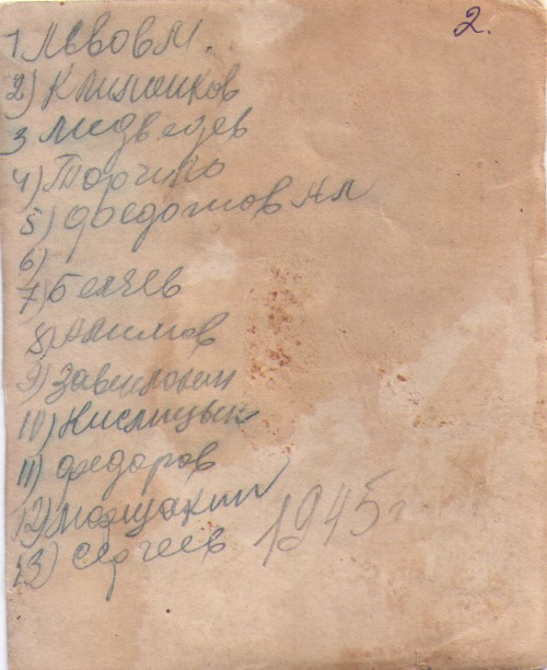 На обороте фронтовых фотографий фамилии и имена сослуживцев Василия Мельникова: Львов М., Клименков, Медведев, Торчило, Федотов, Беляев, Алимов, Завилокин (не точно), Кислицын, Федоров, Морщакин (не точно), Медведев, Евдоким Виноградов.