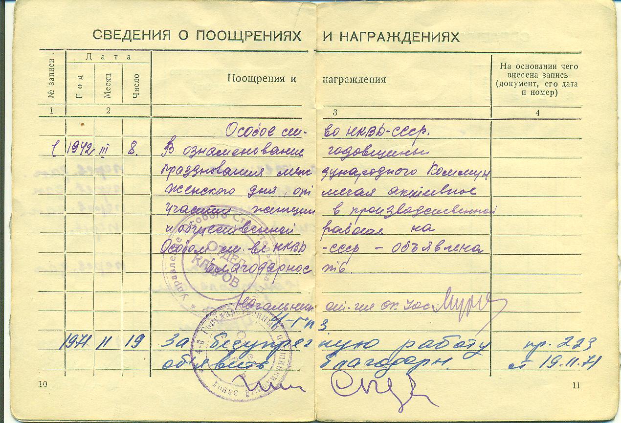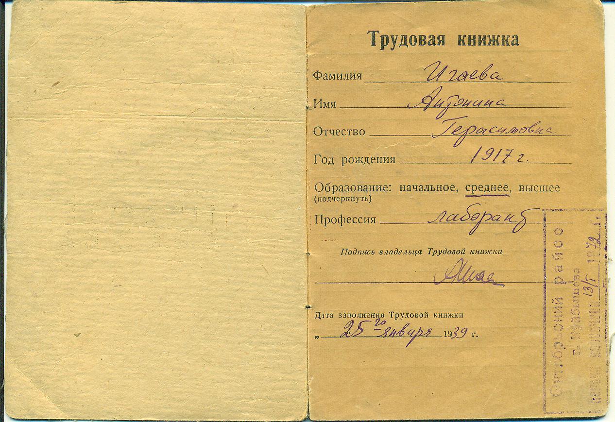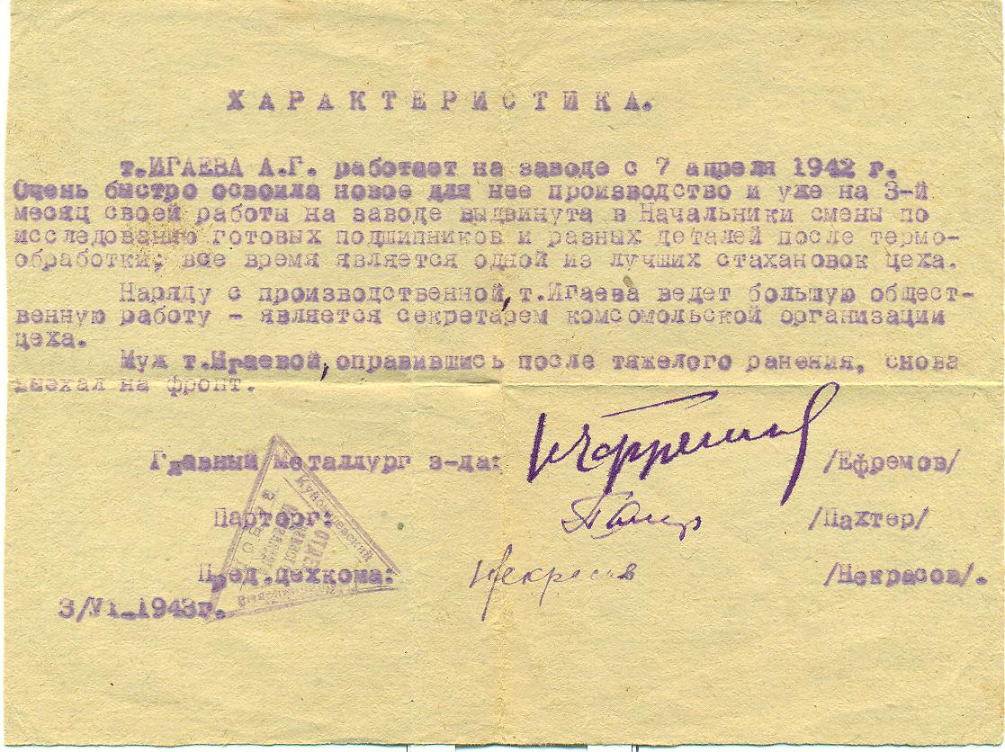 Из трудовой Характеристики: «т. Игаева А.Г. работает на заводе с 7 апреля 1942 г. Очень быстро освоила новое для нее производство и уже на 3-й месяц своей работы на заводе выдвинута в начальники смены по исследованию готовых подшипников и разных деталей после термообработки. Все время является одной из лучших стахановок цеха. Наряду с производственной, т. Игаева ведет большую общественную работу – является секретарем комсомольской организации цеха. Муж т. Игаевой, оправившись после тяжелого ранения, снова выехал на фронт. Подписи: Главный металлург завода Ефремов. Парторг Пахтер. Пред. цехкома Некрасов. 03.06.1943 г.».