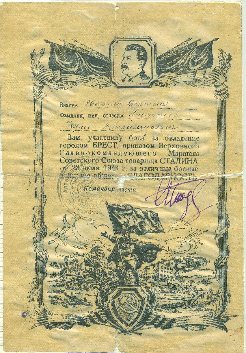 Григорьев Ю.В. Благодарность от 28 июля 1944 года за овладение городом Брест