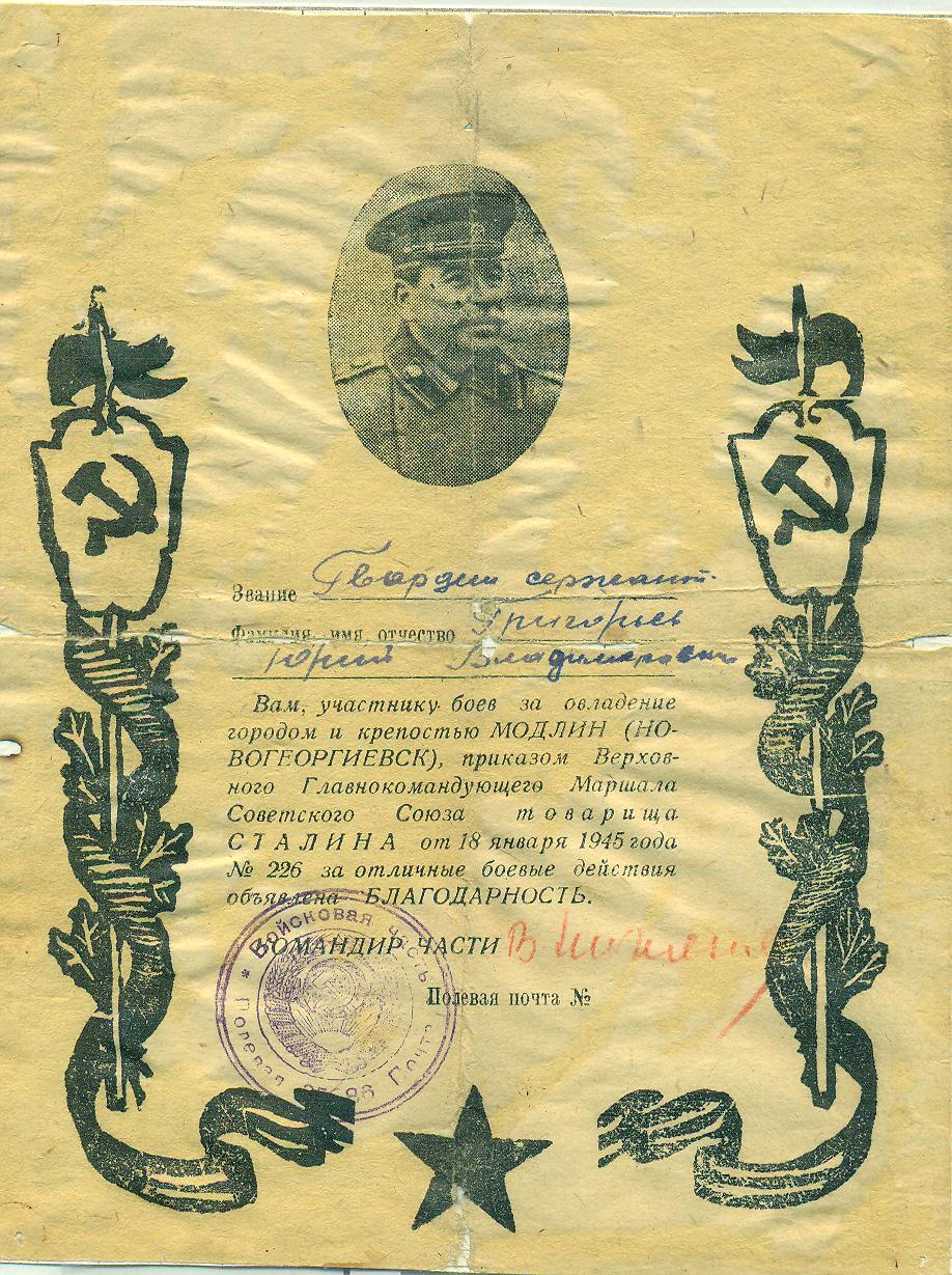 Григорьев Ю.В. Благодарность от 18 января 1945 года за овладение городом и крепостью Модлин (Новогеоргиевск)