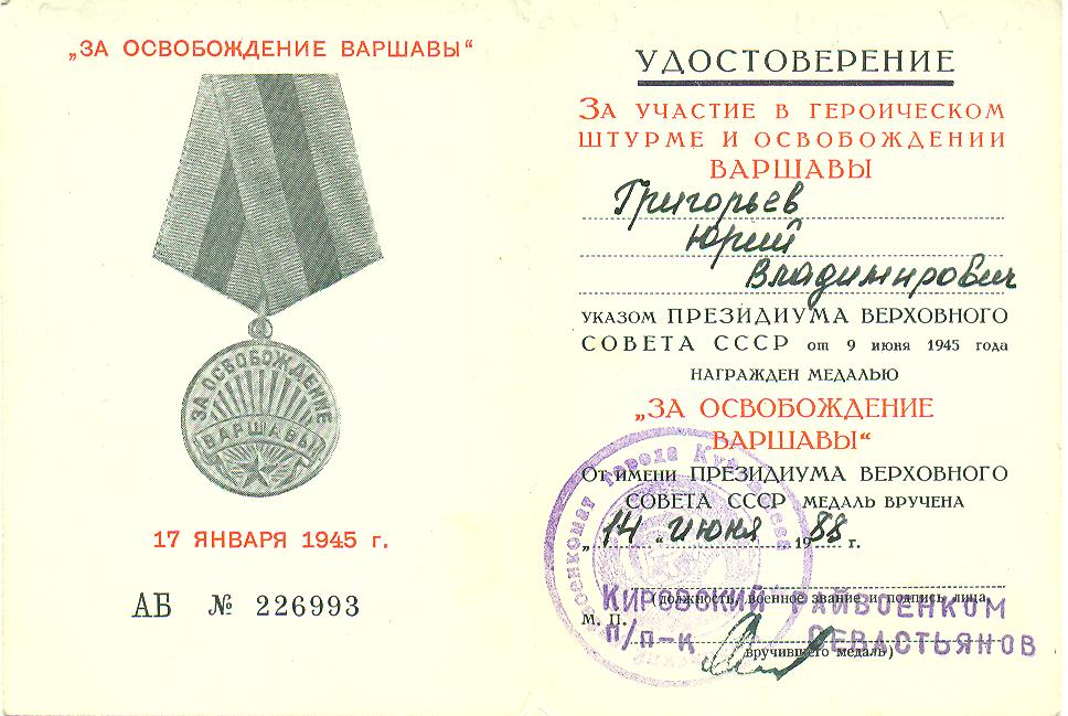 Григорьев Ю.В. Удостоверение к медали «За освобождение Варшавы», медаль вручена 14 июня 1988 г.