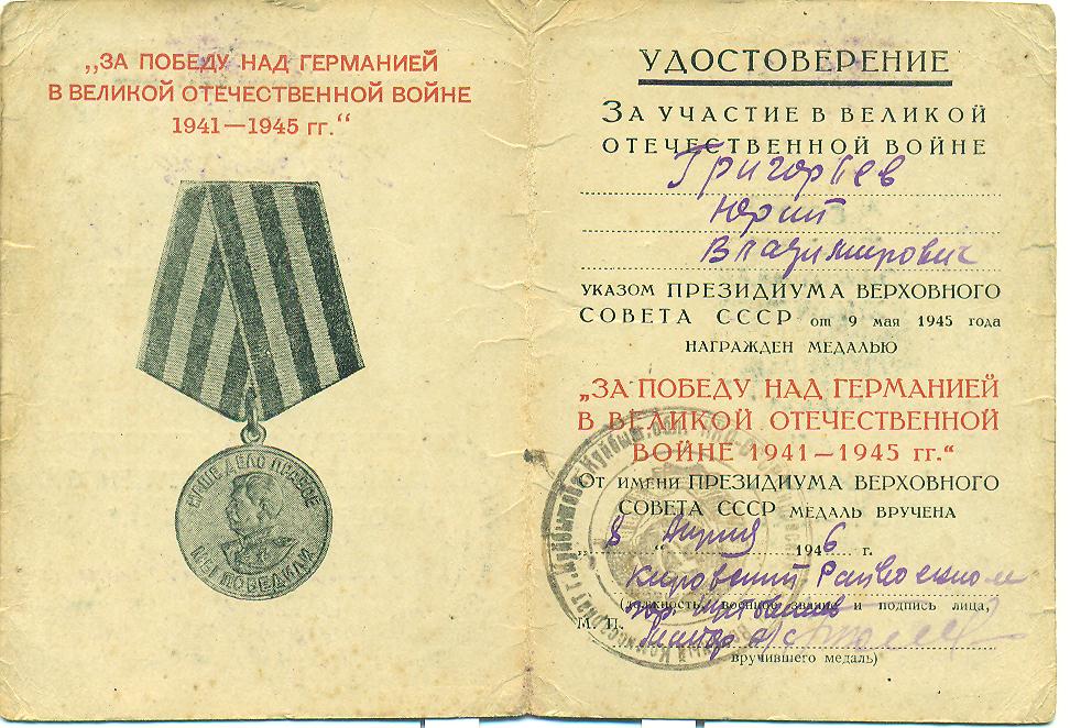 Григорьев Ю.В. Удостоверение к медали «За победу над Германией в Великой Отечественной войне 1941-1945 гг.» медаль вручена 8 апреля 1946 г.