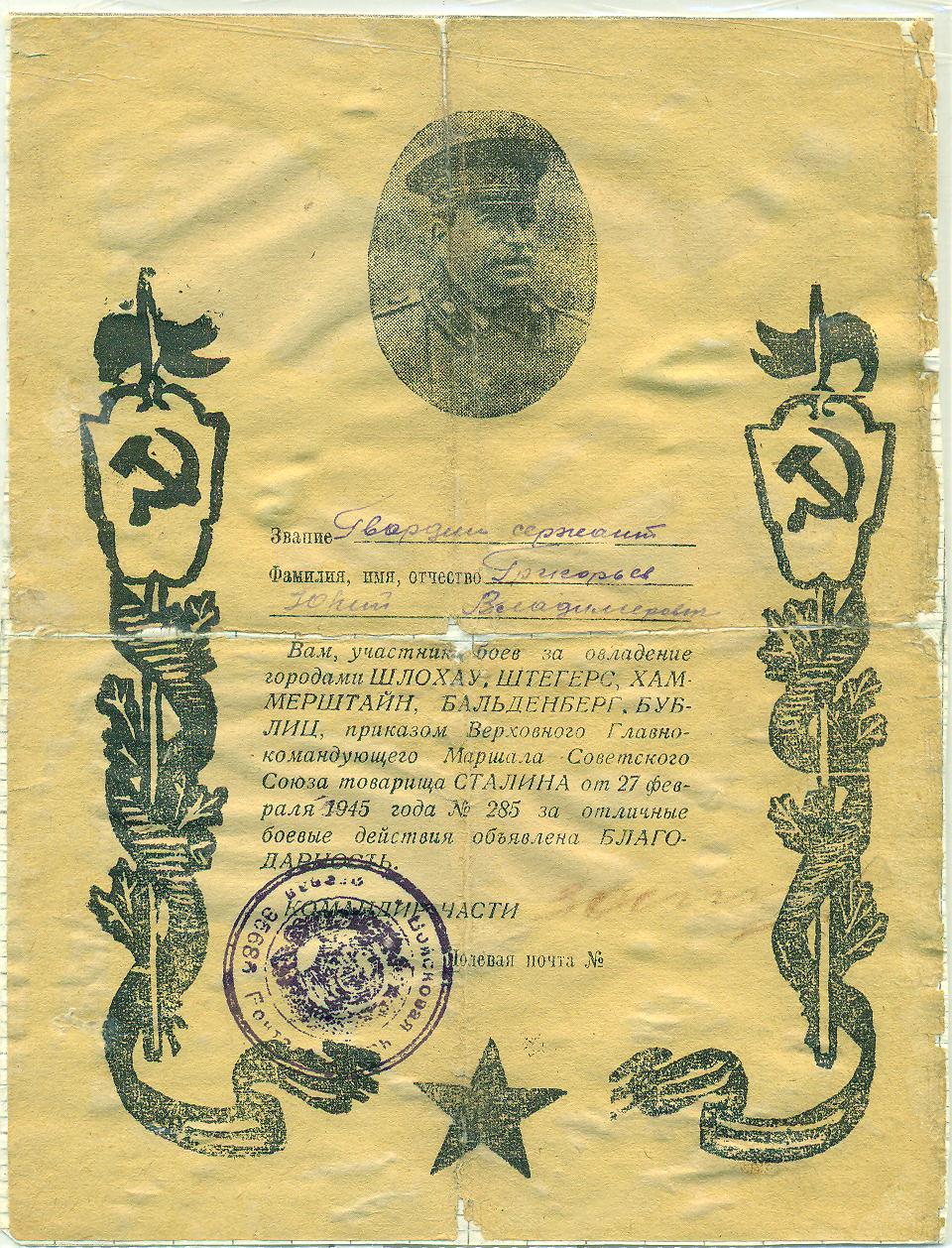Григорьев Ю.В. Благодарность от 27 февраля 1945 года за овладение городами Шлохау, Штегерс, Хаммерштайн, Бальденберг, Бублиц