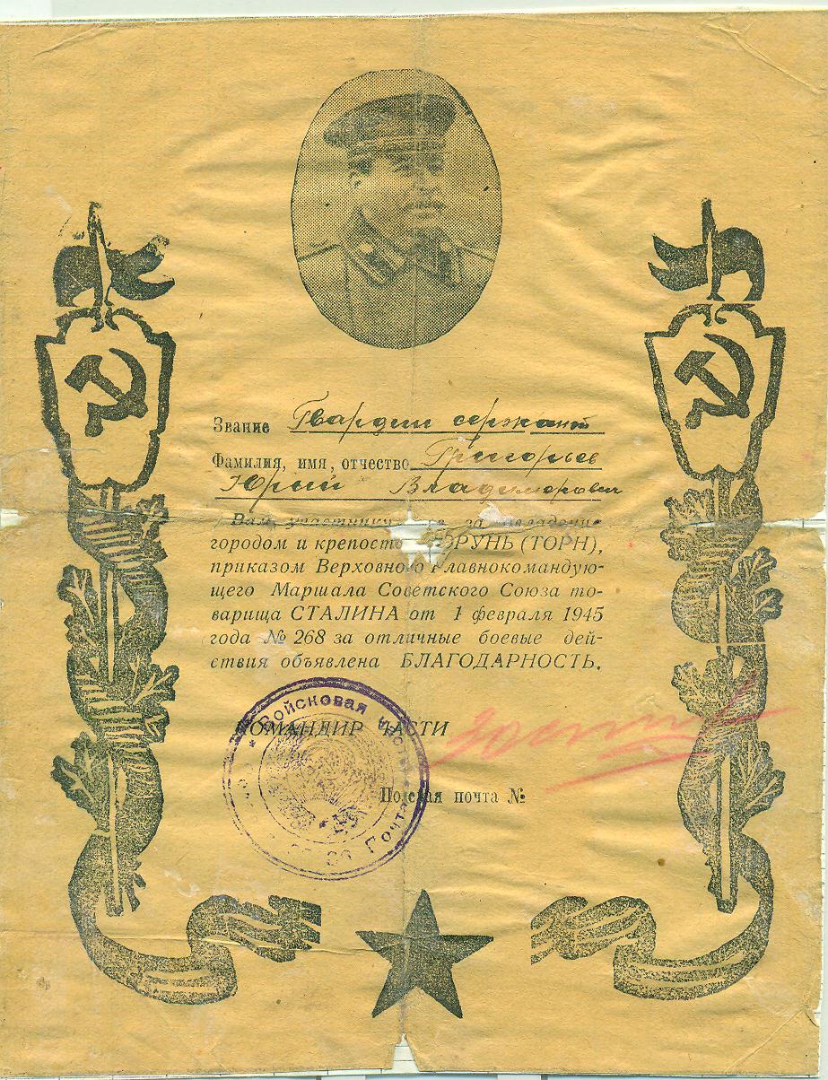 Григорьев Ю.В. Благодарность от 1 февраля 1945 года за овладение городом и крепостью Торунь (Торн)