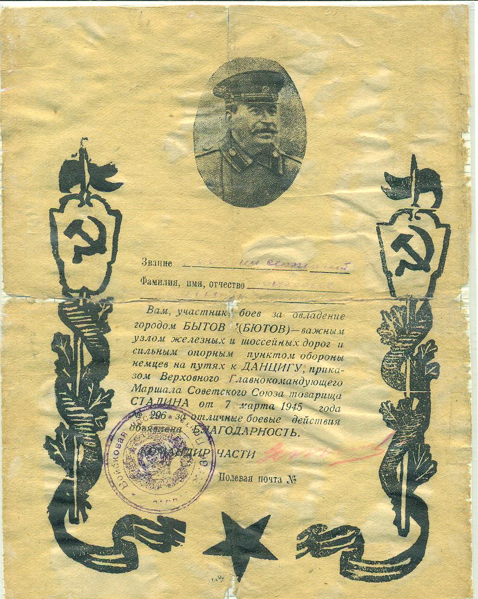 Григорьев Ю.В. Благодарность от 7 марта 1945 года участнику боев за овладение городом Бытов (Бютов)