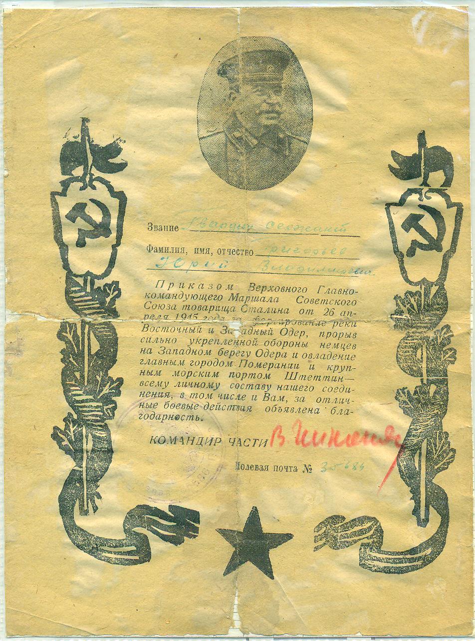 Григорьев Ю.В. Благодарность от 26 апреля 1945 года за форсирование реки Восточный и Западный Одер