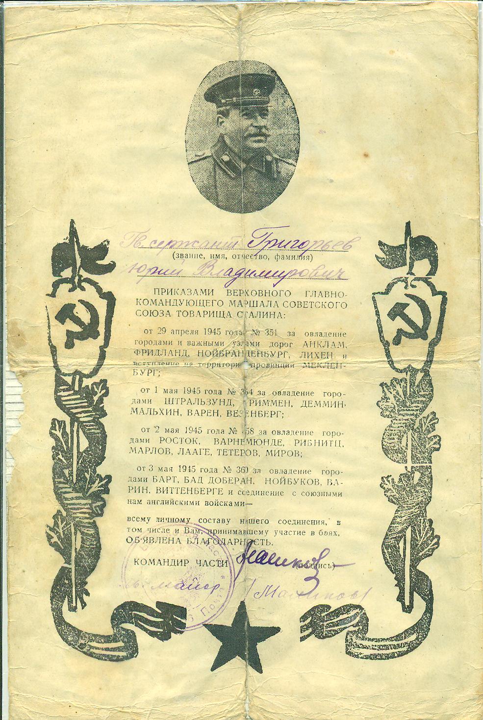 Григорьев Ю.В. Благодарность за участие в боях, апрель-май 1945 г.