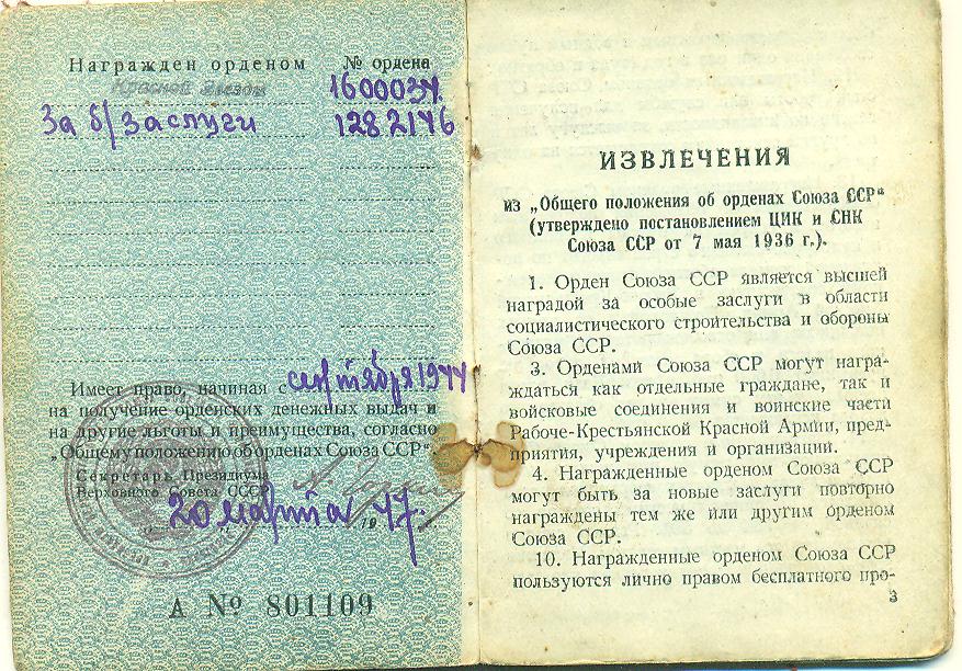 Григорьев Ю.В. Наградная книжка, сентябрь 1944 г. (2 страницы)