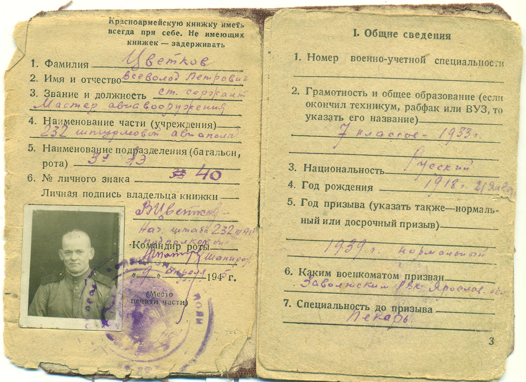 «Наградить медалью "За боевые заслуги" стрелка авиационного вооружения 3-й авиационной эскадрильи сержанта Цветкова Всеволода Петровича за то, что в период с 22 июня 1941 г. по 12 мая 1944 г. лично обслужил и обеспечил безотказной работой стрелково-бомбардировочного вооружения самолета Ил-2 222 успешных боевых вылета на разгром врага, из них 10 боевых вылетов в период Крымской операции на разгром вражеских инженерных сооружений в районе г. Севастополь. Не считаясь ни с какими трудностями, обеспечивал по 2-3 боевых вылета в день. Свой самолет готовит к боевым заданиям быстро и добросовестно. За хорошую работу по обслуживанию матчасти вооружения имеет благодарность от командира авиационной эскадрильи. За указанный период им лично отремонтировано 4 пушки ВЯ, 5 пушек ШВАК, 11 пулеметов ШКАС, 4 пулемета УБТ (наградной лист от 18.05.1944 г.)».
