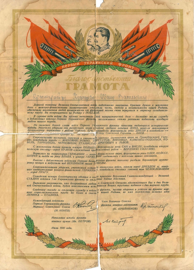 Когда началась Великая Отечественная война, прадед был направлен радистом на Калининский фронт. В ходе войны Иван Васильевич принимал участие в оборонительных боях в районе Калинина, в контрнаступлении под Москвой. Радистом прадед и закончил войну на Первом Украинском фронте. Участвовал во взятии Берлина, освобождении Праги.