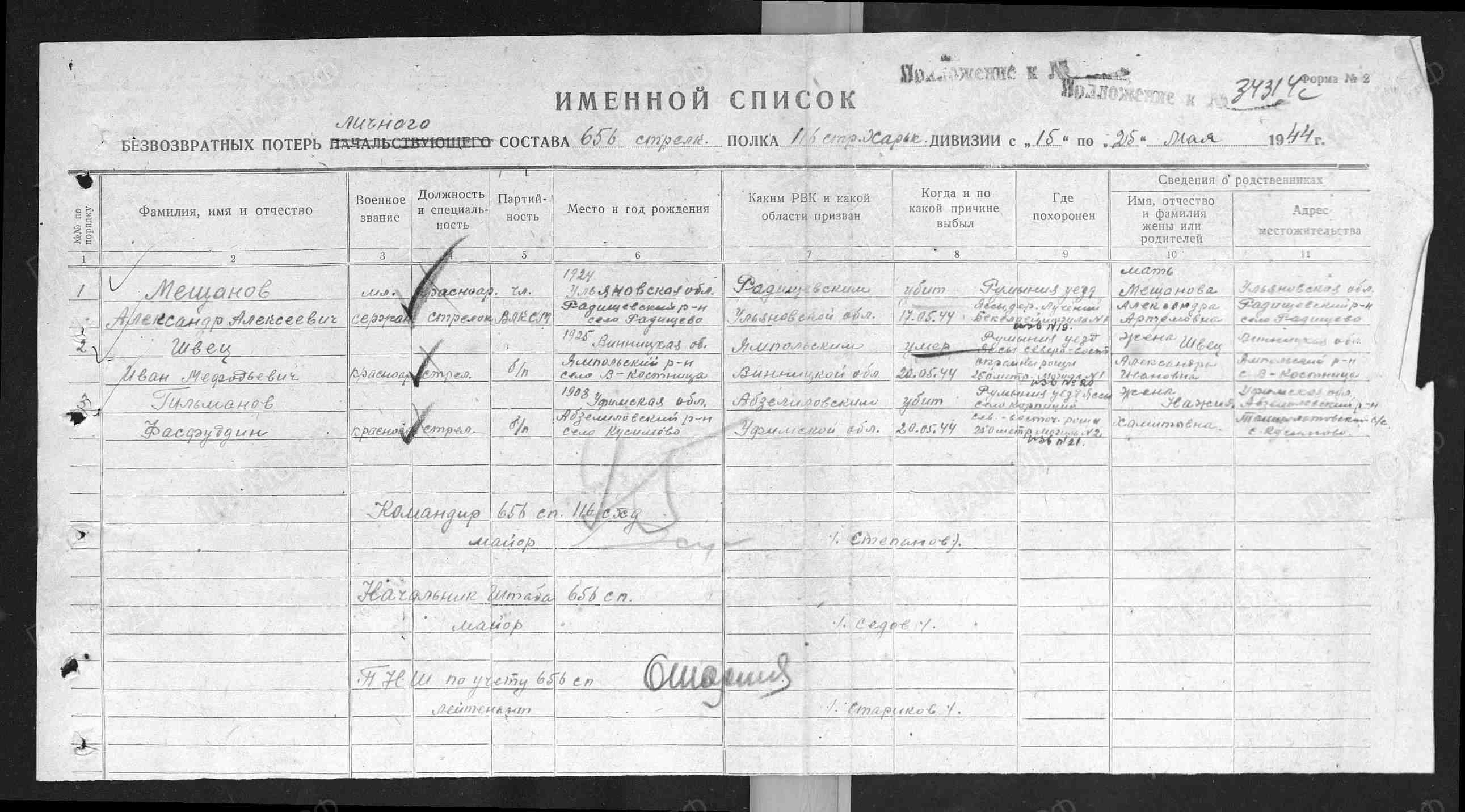 Родился в 1924 году в с. Радищево Ульяновской области. Ушел на фронт сразу после окончания средней школы. Воинское звание: мл. сержант. Александр Мещанов был убит 17 мая 1944 года. Похоронен в Румынии, уезд Яссы.