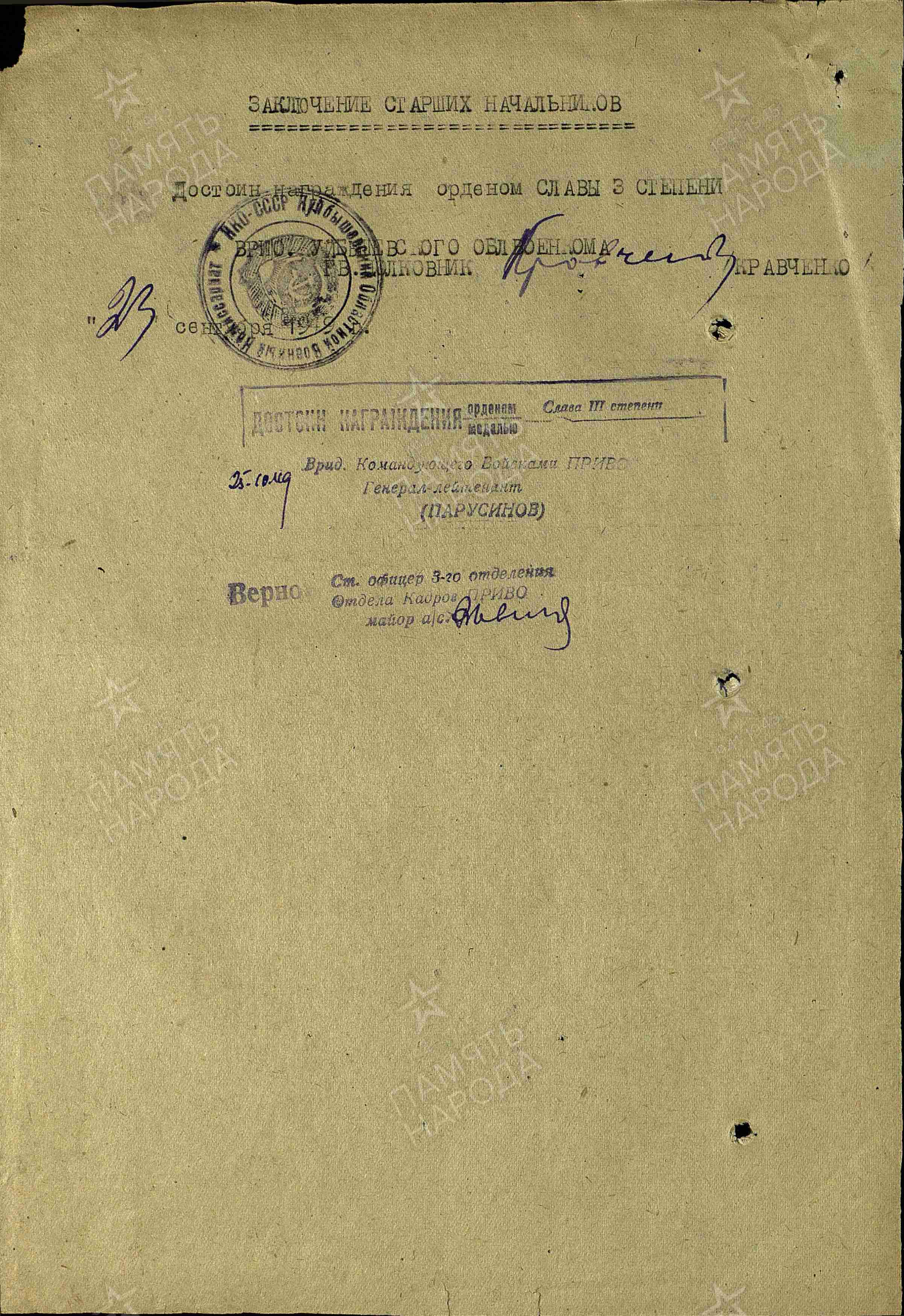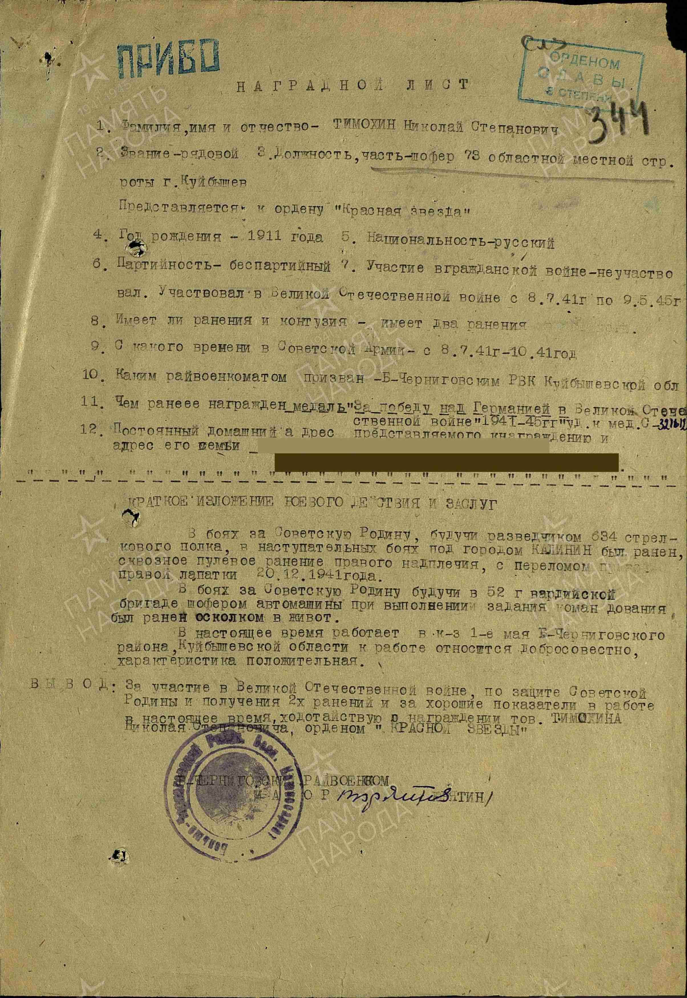 Родился 22 мая 1911 г. в с. Телешовка Пестравского района Куйбышевской области. Призван Большечерниговским РВК 8 июля 1941 г. Полковой разведчик. Был тяжело ранен.