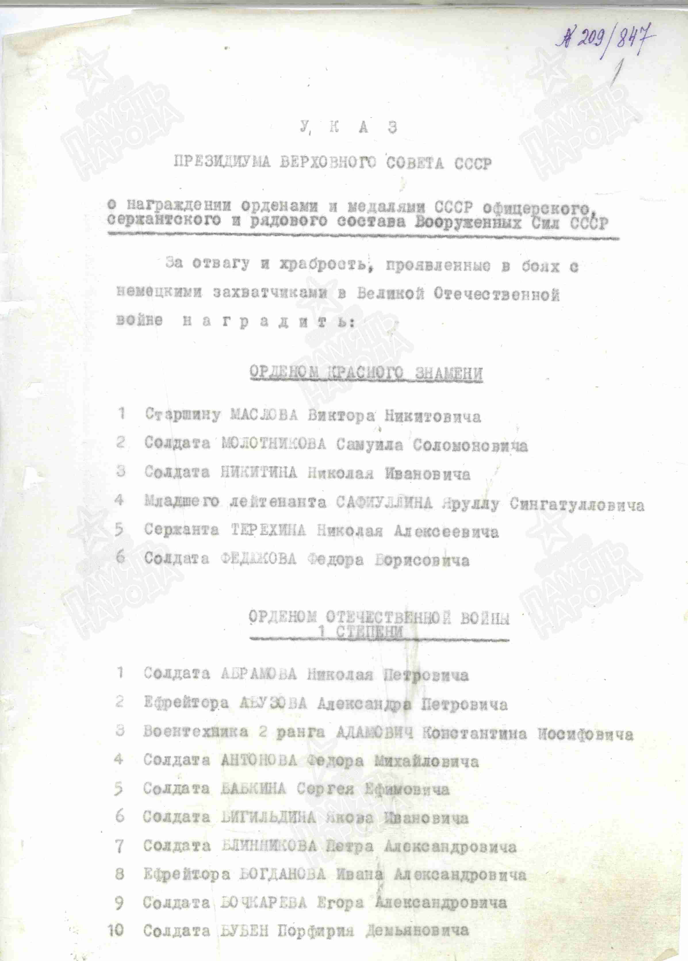 Из наградного листа стало известно следующее: «В боях за Советскую Родину, будучи разведчиком 634 стрелкового полка, в наступательных боях под г. Калинин был ранен сквозным пулевым ранением правого надплечья и переломом правой лопатки 20 декабря 1941 г. В боях за Советскую Родину, будучи в 52 гвардейской бригаде шофером автомашины, при выполнении задания командования, был ранен осколком в живот».