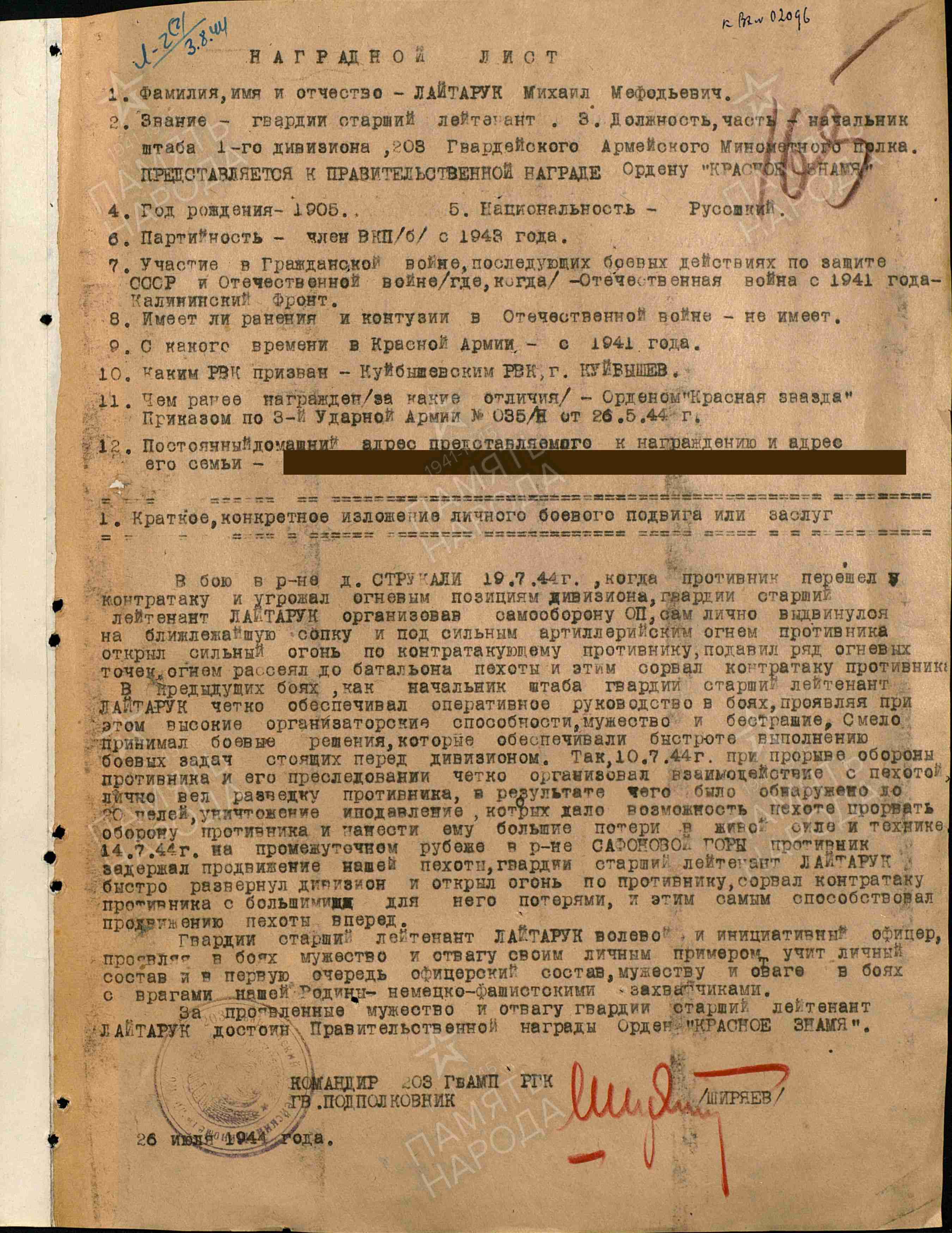 Старший лейтенант Лайтарук Михаил Мефодиевич погиб 21 августа 1944 г. Другой информации на сегодняшний день нет.