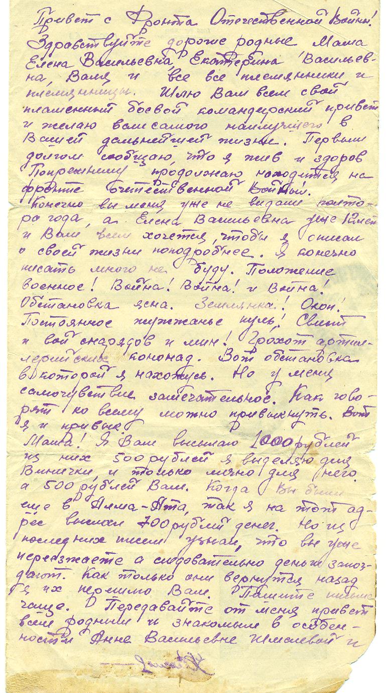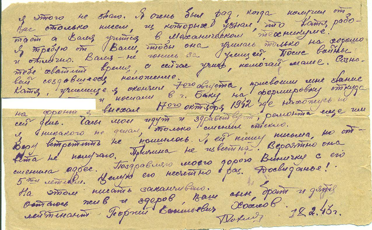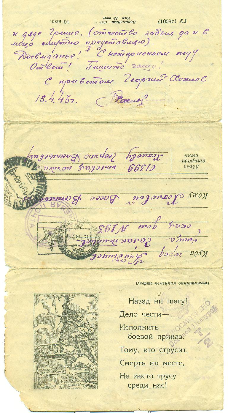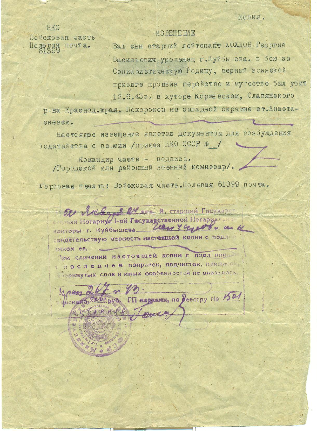 Из официального письма: «Администрация Коржевского сельского поселения с большим удовольствием и почтением к памяти Вашего дяди отвечает Вам на ваше письмо. Действительно Ваш дядя Хохлов Георгий Васильевич, геройски по¬гиб при освобождении нашего хутора: ....