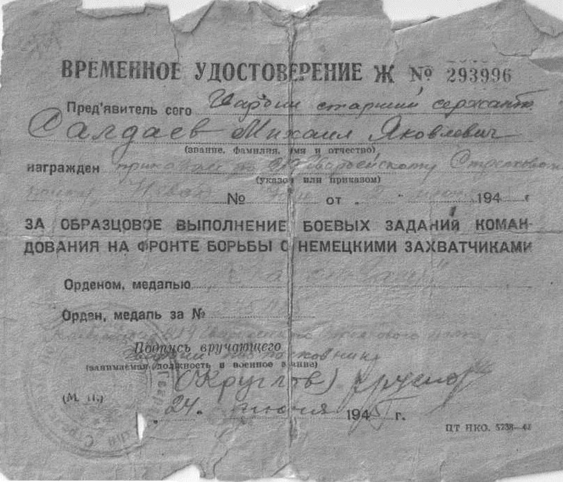 Информация, размещённая в Галерее «Дорога Памяти»: «Мой папа - Михаил Яковлевич - родился в 1923 году. Восемнадцатилетним мальчишкой ушел на войну. Участвовал в боях за Сталинград, в освобождении г. Ленинграда. Был ранен, контужен. Указом Президиума Верховного Совета СССР от 22 декабря 1942 года награжден медалью «За оборону Ленинграда». Медаль Т 06756 вручена 21 июня 1943 года. За образцовое выполнение боевых заданий командования на фронте борьбы с немецкими захватчиками был награжден медалью «За отвагу» (2751185) приказом по 219 Гвардейскому стрелковому полку от 2 июня 1945 г. Имеется справка, подписанная полковником А. Абрамяном, которая свидетельствует о том, что на основании Указа Президиума Верховного Совета СССР от 9 мая 1945 г. имеет право на получение медали «За победу над Германией в Великой Отечественной войне 1941-1945 гг.». Медаль не вручена. А удостоверение от 4/11 1945 года (4-115) подтверждает, что Гвардии сержант Салдаев Михаил Яковлевич состоит на действительной службе в 219 Гвардейском Стрелковом Полоцком Краснознаменном ордена Кутузова 3 степени полку 71 Гвардейской Стрелковой Витебской ордена Ленина Краснознаменной дивизии, имеет право носить значок Гвардия.