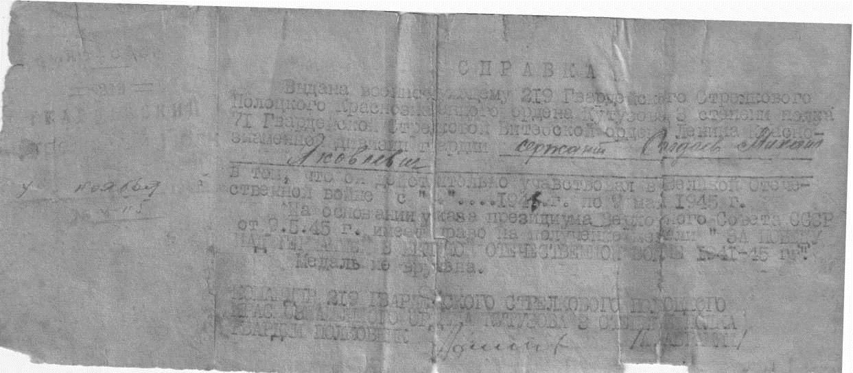 После войны Михаил Яковлевич работал в колхозе имени Сталина Кошкинского района Куйбышевской области трактористом, впоследствии - бригадиром комплексной бригады. Сохранилась почетная грамота Куйбышевского обкома ВЛКСМ, датированная июнем 1949 года, которой был награжден папа за активное участие в социалистическом соревновании и высокие производственные показатели на весеннем севе. Я горжусь, что мой папа в годы Великой Отечественной войны защищал Родину от врагов и бережно отношусь к семейным реликвиям, сохранившимся благодаря нашей маме, со времен тех тяжелейших дней в жизни нашего народа. Документы, награды отца использую в качестве наглядных пособий при проведении уроков мужества, бесед с детьми, встреч с ветеранами. Мечтаю встретиться с однополчанами Салдаева Михаила Яковлевича и услышать рассказы из их уст о боевом пути 71 Гвардейской стрелковой Витебской дивизии".