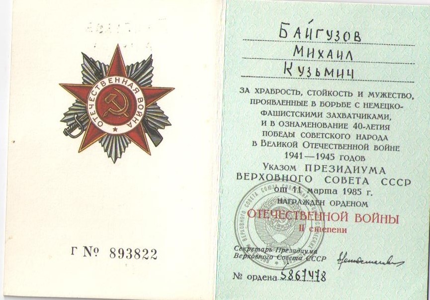 Данные фотографии и документы принадлежали Байгузову Михаилу Кузьмичу, участнику Великой Отечественной войны. Год рождения: 1911. Место рождения: Куйбышевская обл., Больше-Черниговский р-н, с. Украинка. Старший лейтенант, в РККА с 1933 года.