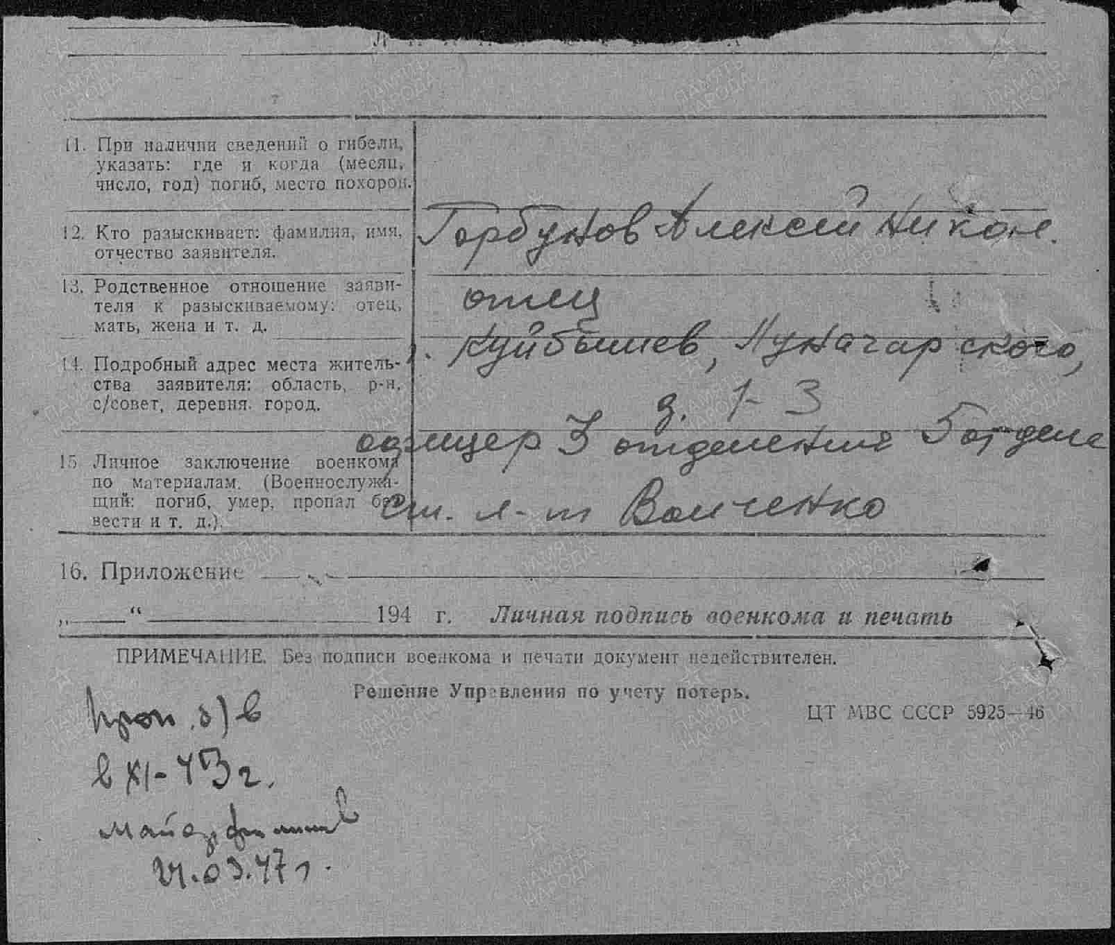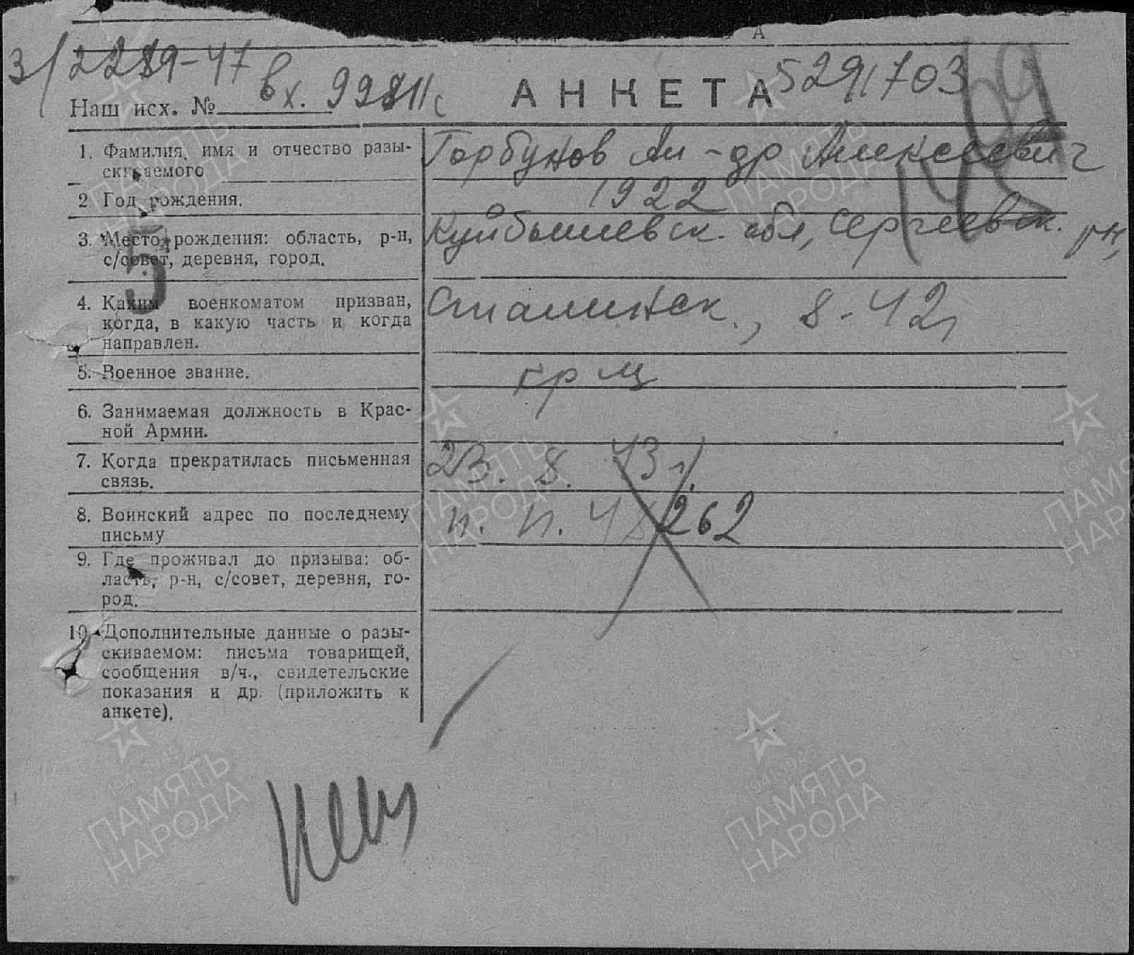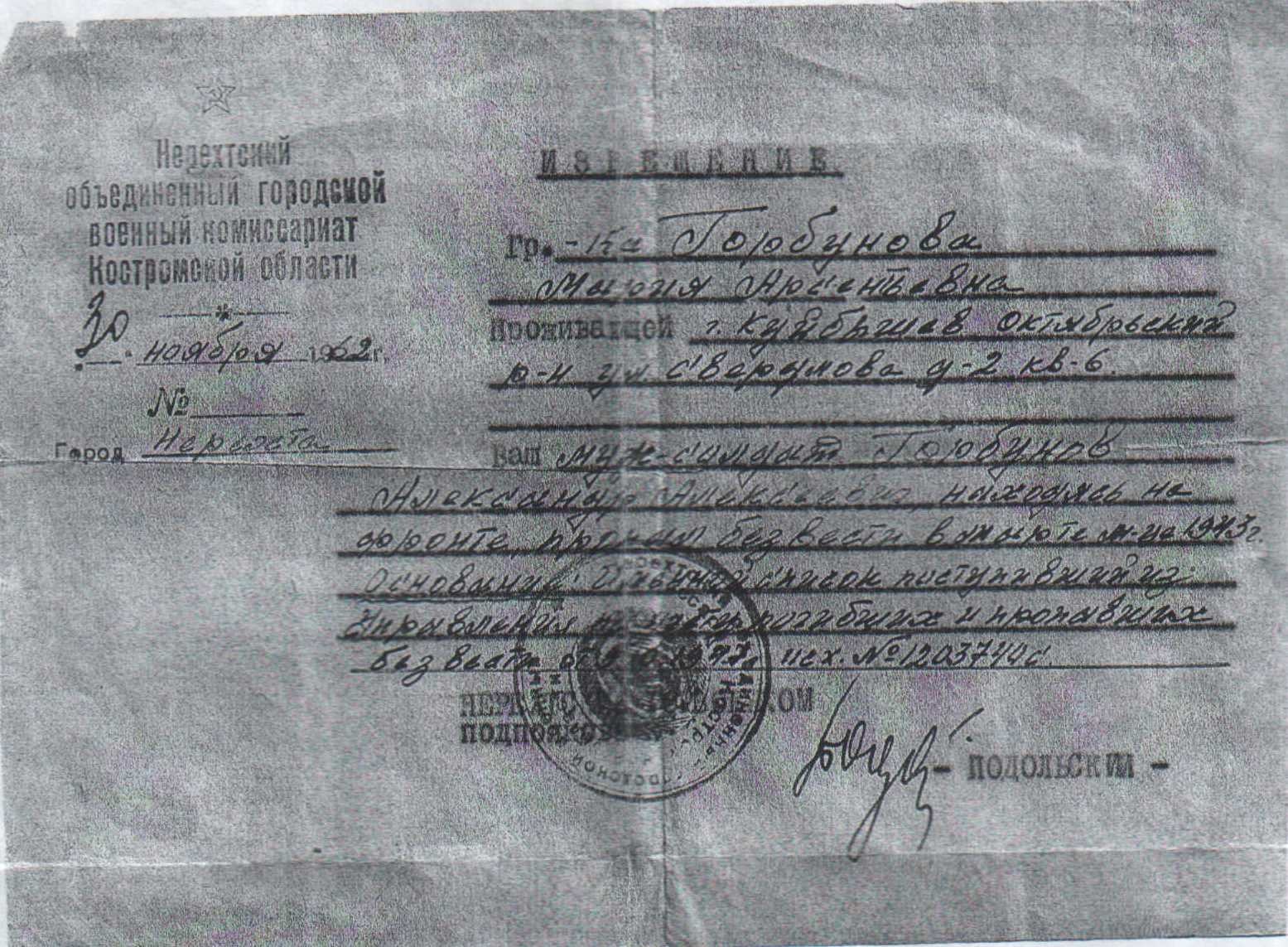 В ноябре 1962 года на имя его жены, Горбуновой Марии Арсентьевны, пришло Извещение о гибели мужа (пропал без вести), направленное Нерехтским городским объединенным военным комиссариатом Костромской области.