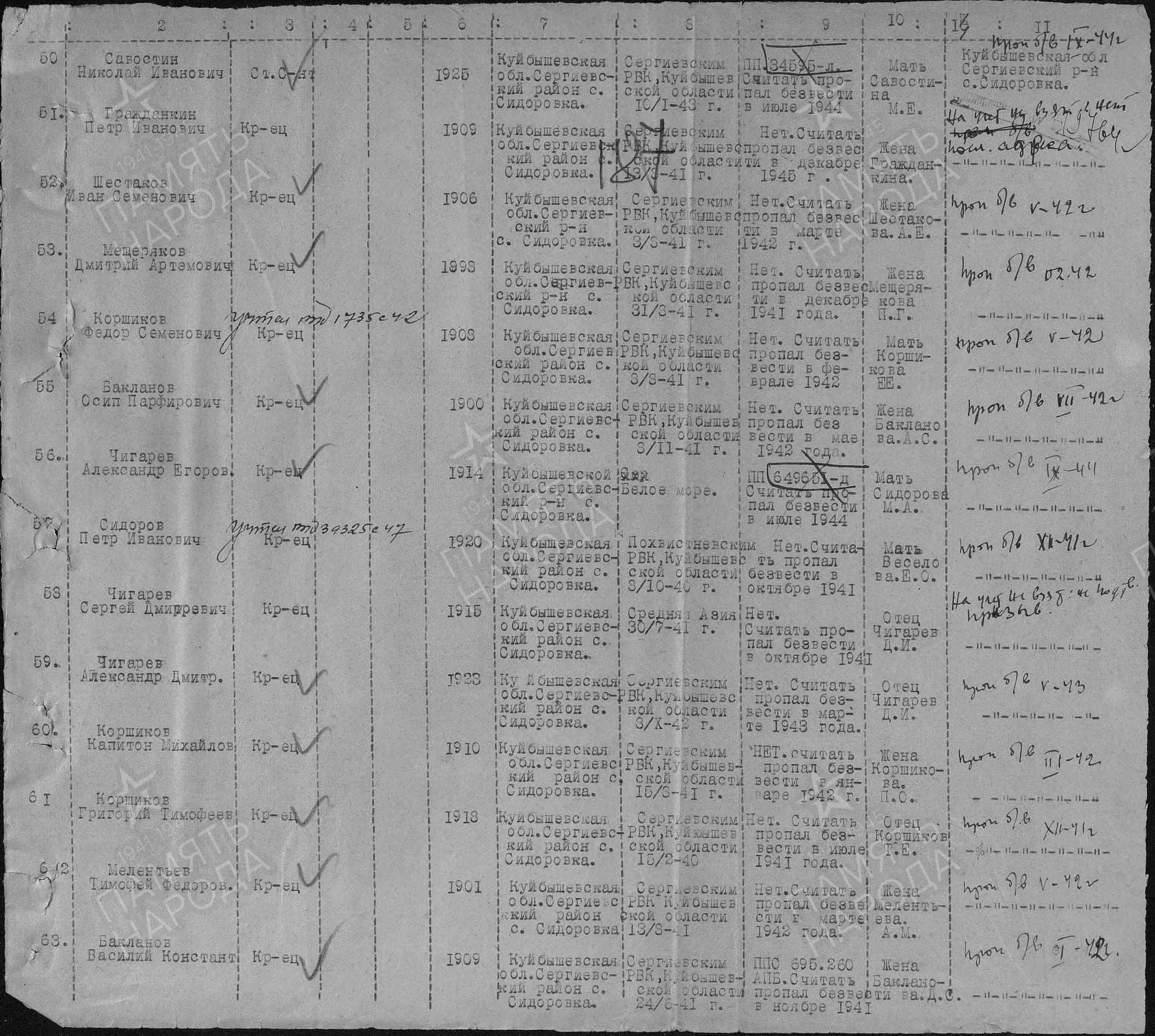На единственной сохранившейся предвоенной фотографии Пётр Сидоров (1920-1941), уроженец села Сидоровка Сергиевского района Самарской области. Старший сын в многодетной крестьянской семье. Был призван в армию 14.10.1940 г. Похвистневским РВК (Куйбышевская обл.). После начала войны был сразу оправлен на фронт. Место службы п/я 84. Перед отправкой на фронт его часть стояла неподалеку от родных мест, и его мать ездила повидаться с сыном. Это была их последняя встреча. Прислал всего одно письмо домой матери о прибытии на место. Больше никаких вестей о Петре до окончания войны не было.