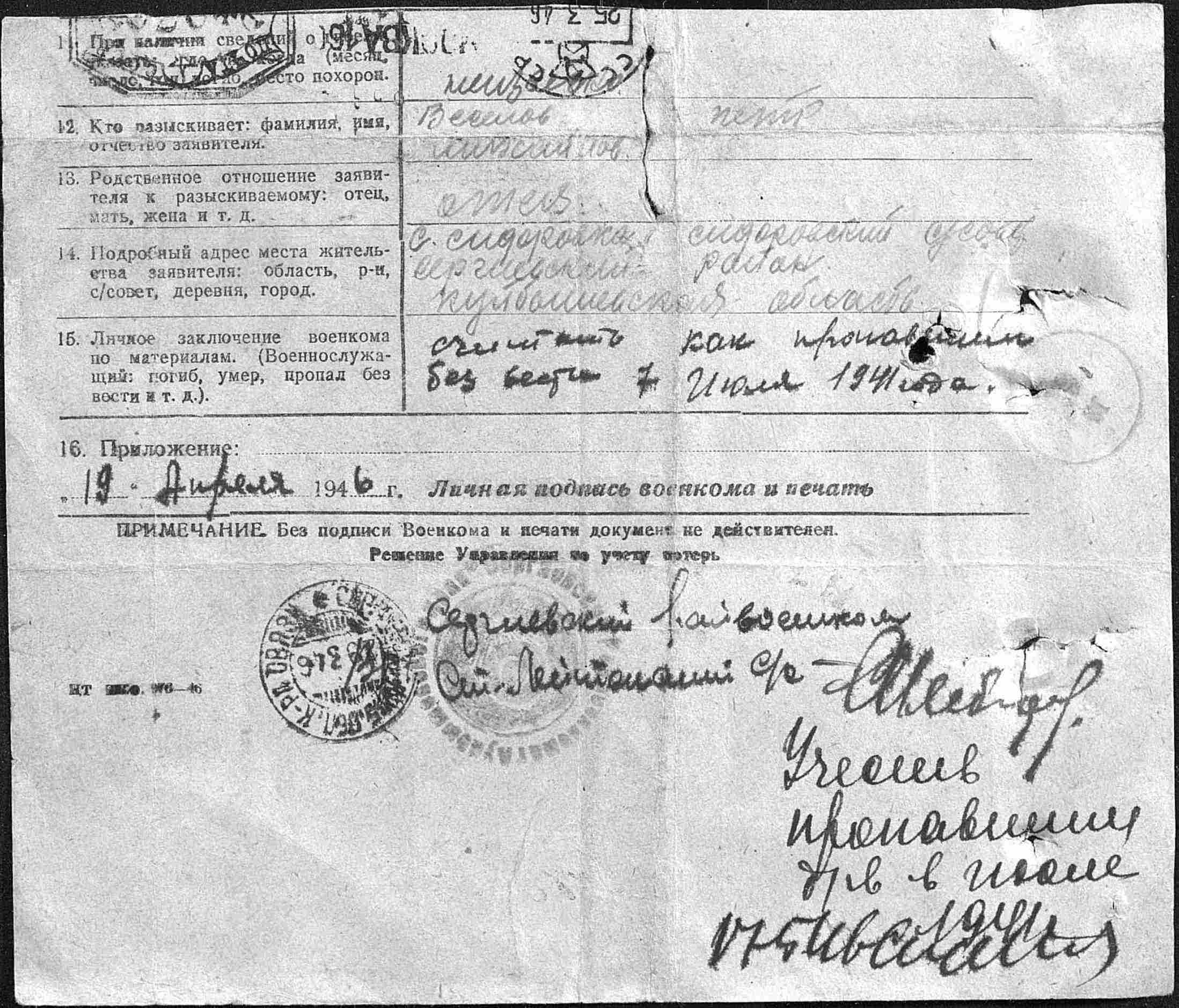 В 1946 году отчим Петра (он воспитывал Петра с 3-летнего возраста), Веселов П.М., вернувшийся с войны, сделал запрос в Сергиевский военкомат о судьбе сына. Вскоре пришло сообщение о том, что рядовой Пётр Сидоров пропал без вести 7 июля 1941 года (видимо, в первом же бою). О Сидорове Петре Ивановиче имеется запись в ОДБ Мемориал (№ 7221476). Место захоронения неизвестно.