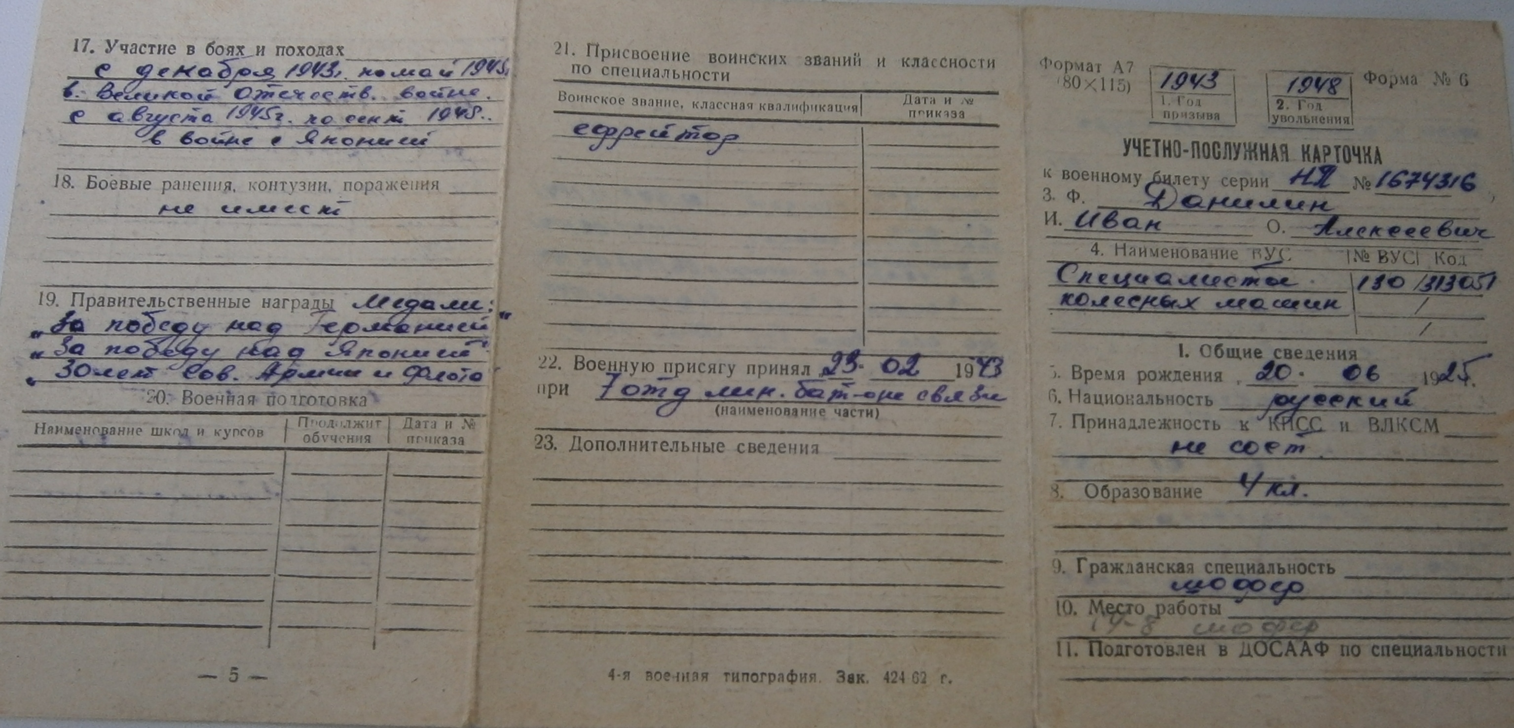 Иван Данилин родился 20 июня 1925 г. в деревне Ключи Ртищевского района Саратовской области. Гражданская специальность: шофер.