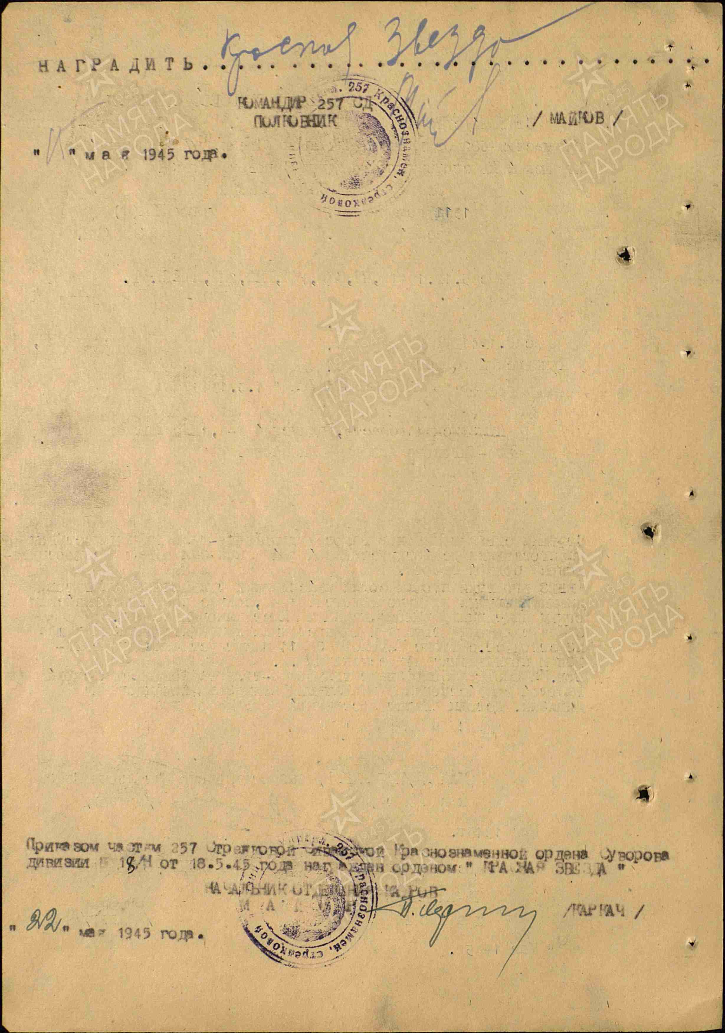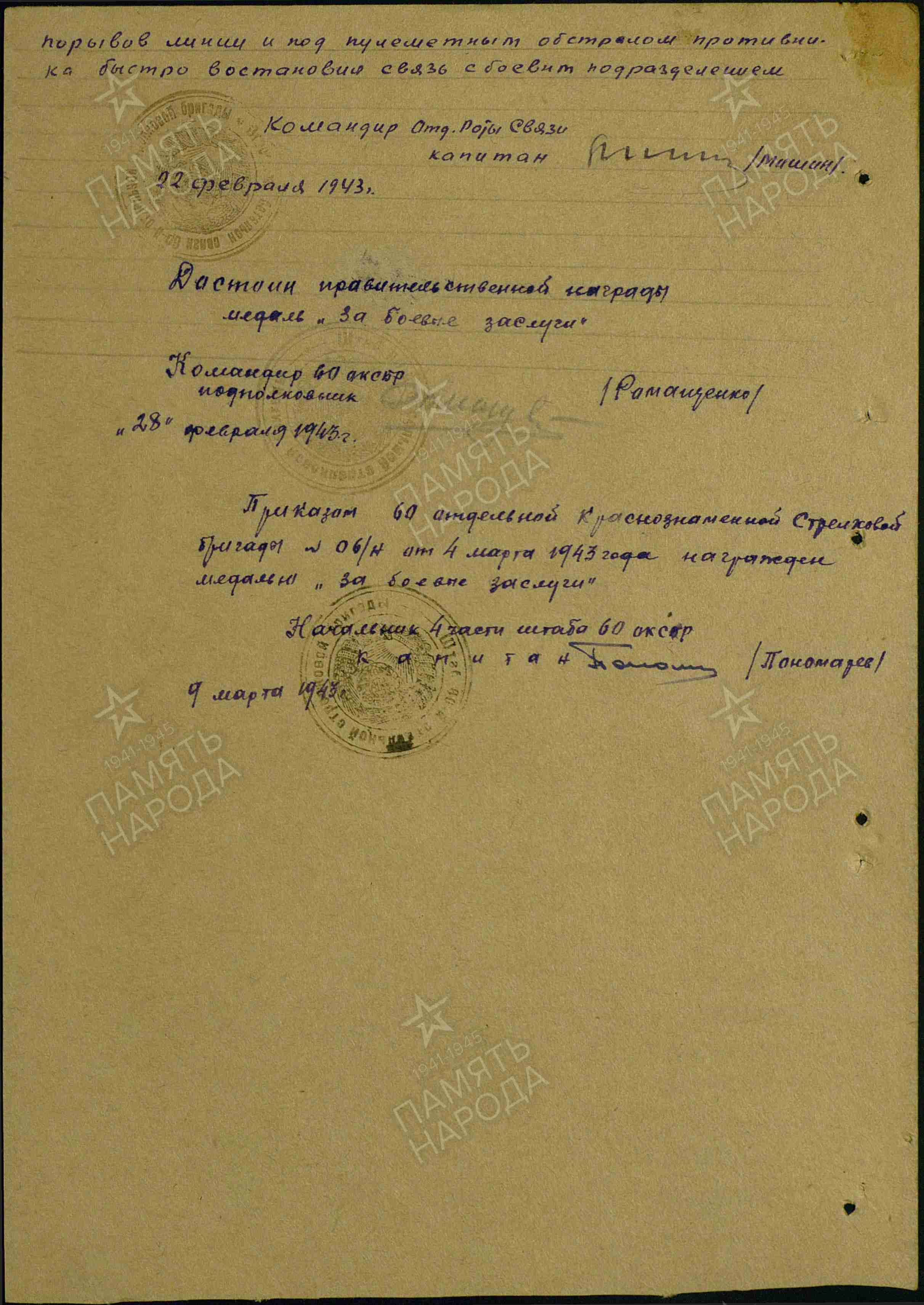 Награжден медалью «За боевые заслуги» (1943 г.), орденом Красной Звезды (1945 г.)