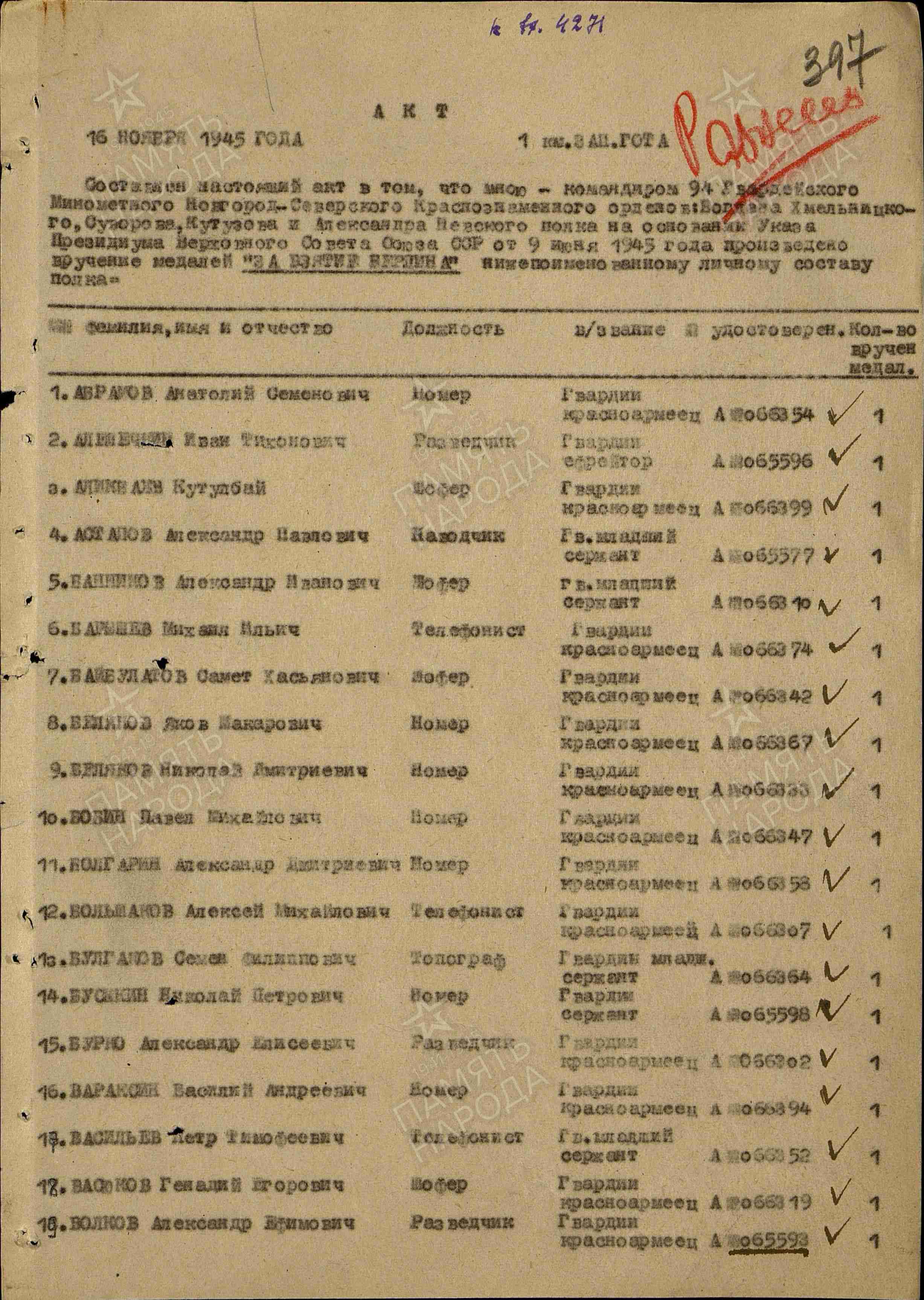 В приказе о награждении № 015/н от 27 июня 1945 года говорится: «За образцовое выполнение боевых заданий командования на фронте борьбы с немецкими захватчиками и проявленные при этом доблесть и мужество от имени Президиума Верховного Совета Союза ССР награждаю медалью «За отвагу»: 1. Орудийного номера 2-й батареи 1-го дивизиона гвардии младшего сержанта Астапова Александра Павловича. За период борьбы с немецкими оккупантами от Одера до Берлина тов. Астапов показал себя смелым, инициативным гвардейцем. 19.04.45 года огневая позиция батареи подверглась сильному артминомётному обстрелу со стороны противника. Требовалось немедленно открыть огонь по контратакующей пехоте противника. Товарищ Астапов, как всегда, хладнокровно заряжал установку, своим личным примером увлёк за собой остальных гвардейцев, способствовал своевременному открытию огня по контратакующему противнику. Батарея выполнила свою боевую задачу».
