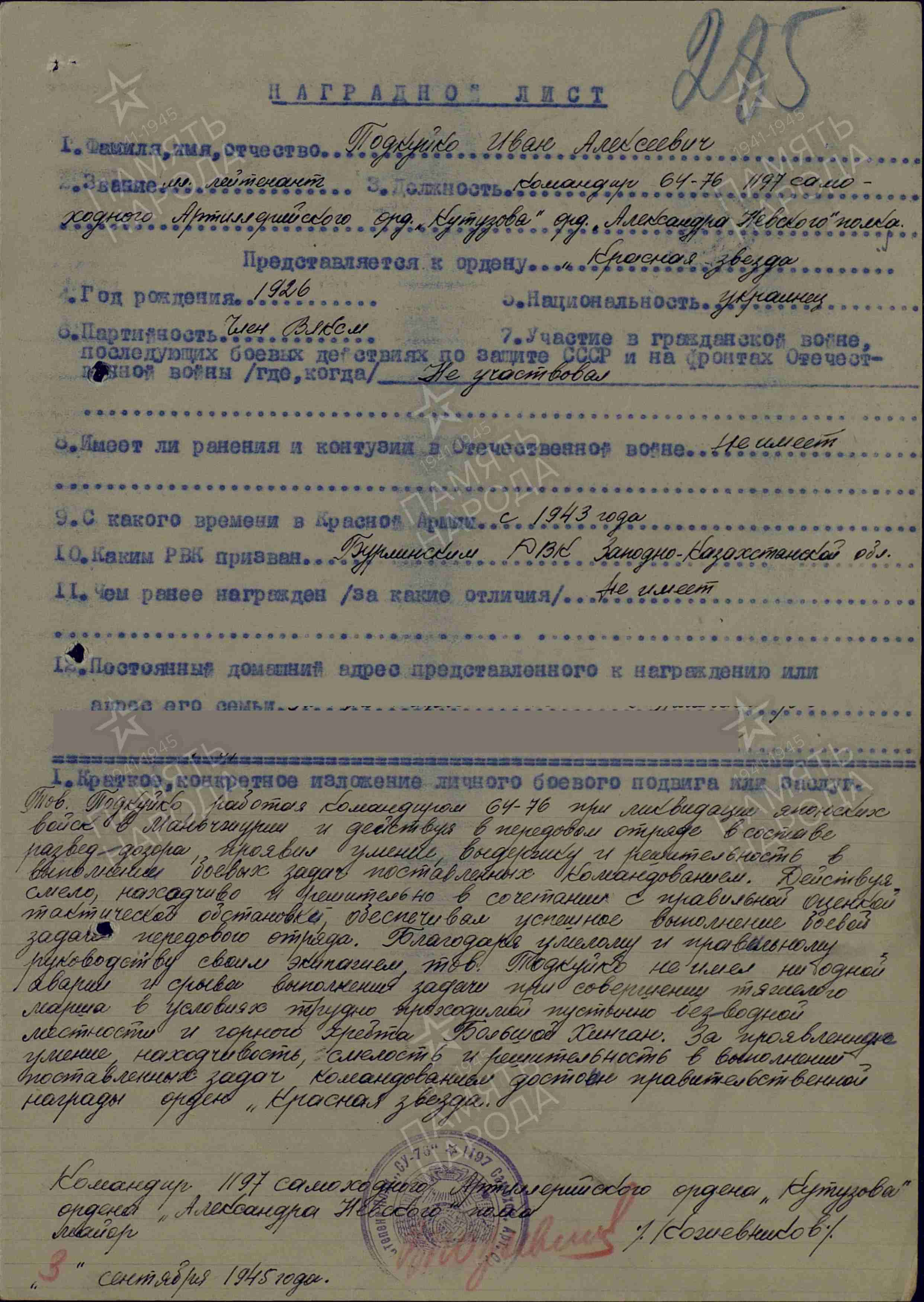 Иван Подкуйко родился в крестьянской семье 15 февраля 1926 года. В 17 лет, будучи учеником 10 класса, в октябре 1943 года призван на военную службу. Прошел годичное обучение в танковом училище в городе Оренбурге. Участвовал в войне с Японией в качестве командира боевой машины САУ отдельного полка 39 армии Забайкальского фронта. Демобилизован в феврале 1947 года. Полковник в отставке.