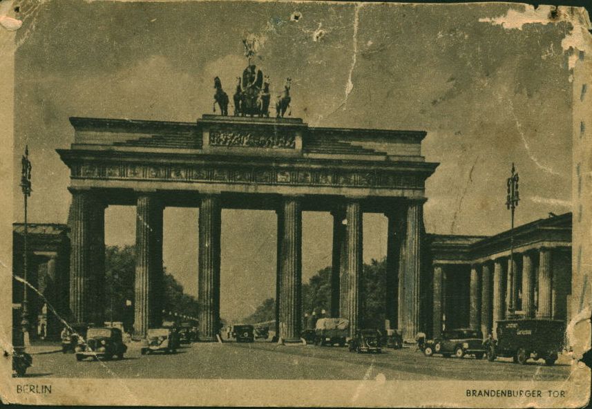 Каюрова Т.Т. Надпись на обороте почтовой открытки: «Коля, вот смотри, Бранденбургские ворота в Берлине, где развевается знамя, которое под весили наши танкисты. Через эти ворота проезжала и я, но сейчас этих лошадей нет, снарядами с пушек сбили и один конец ворот тоже разбит»