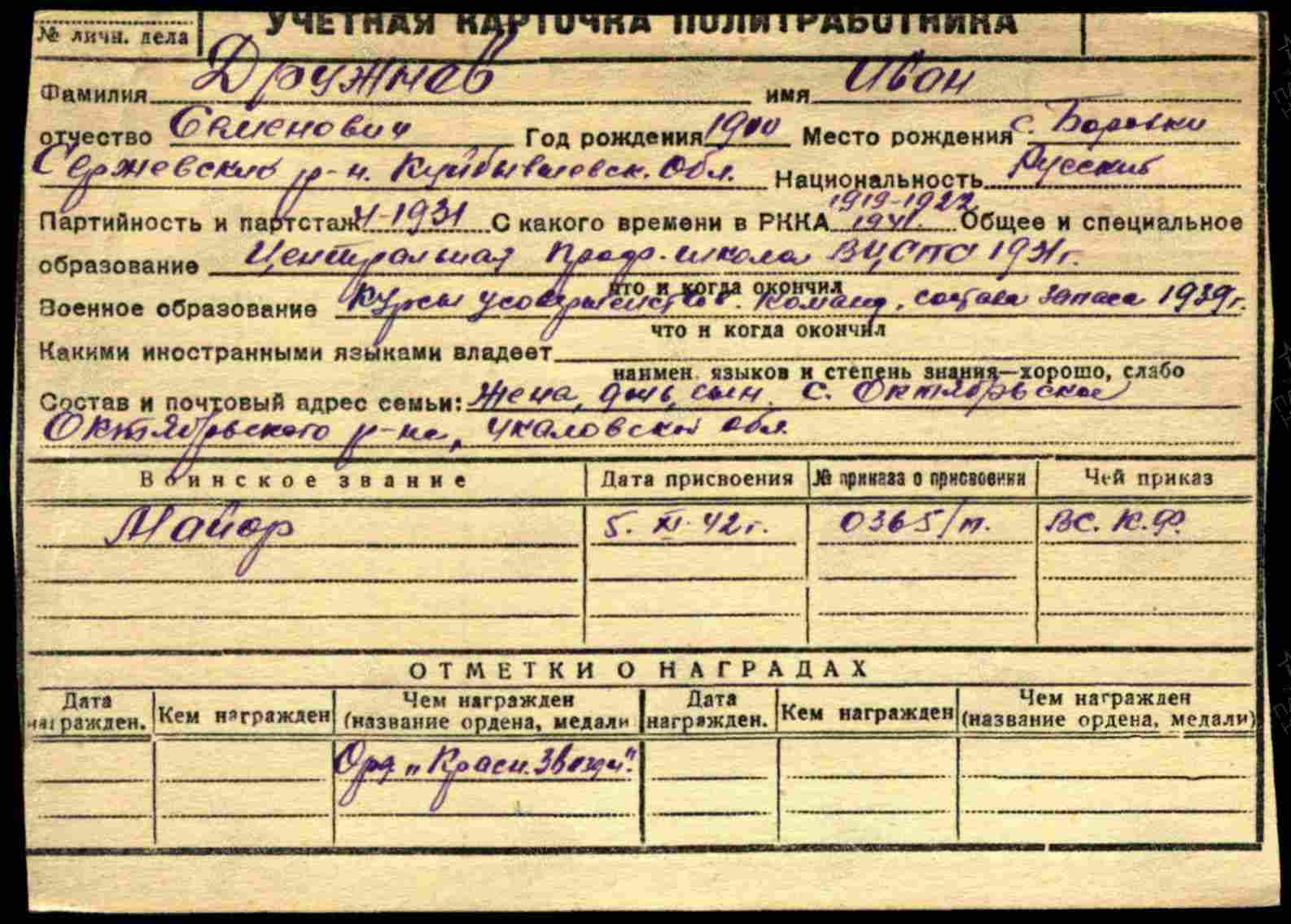 Иван Дружнев родился в 1900 году в селе Боровка Сергиевского района Куйбышевской (Самарской) области. В 1931 году окончил Центральную профсоюзную школу ВЦСПС. В 1939 году окончил курсы усовершенствования командного состава запаса. Майор, старший инструктор политотдела 360 стрелковой дивизии. Был награжден орденом Красной Звезды, орденом Отечественной войны i степени (посмертно).