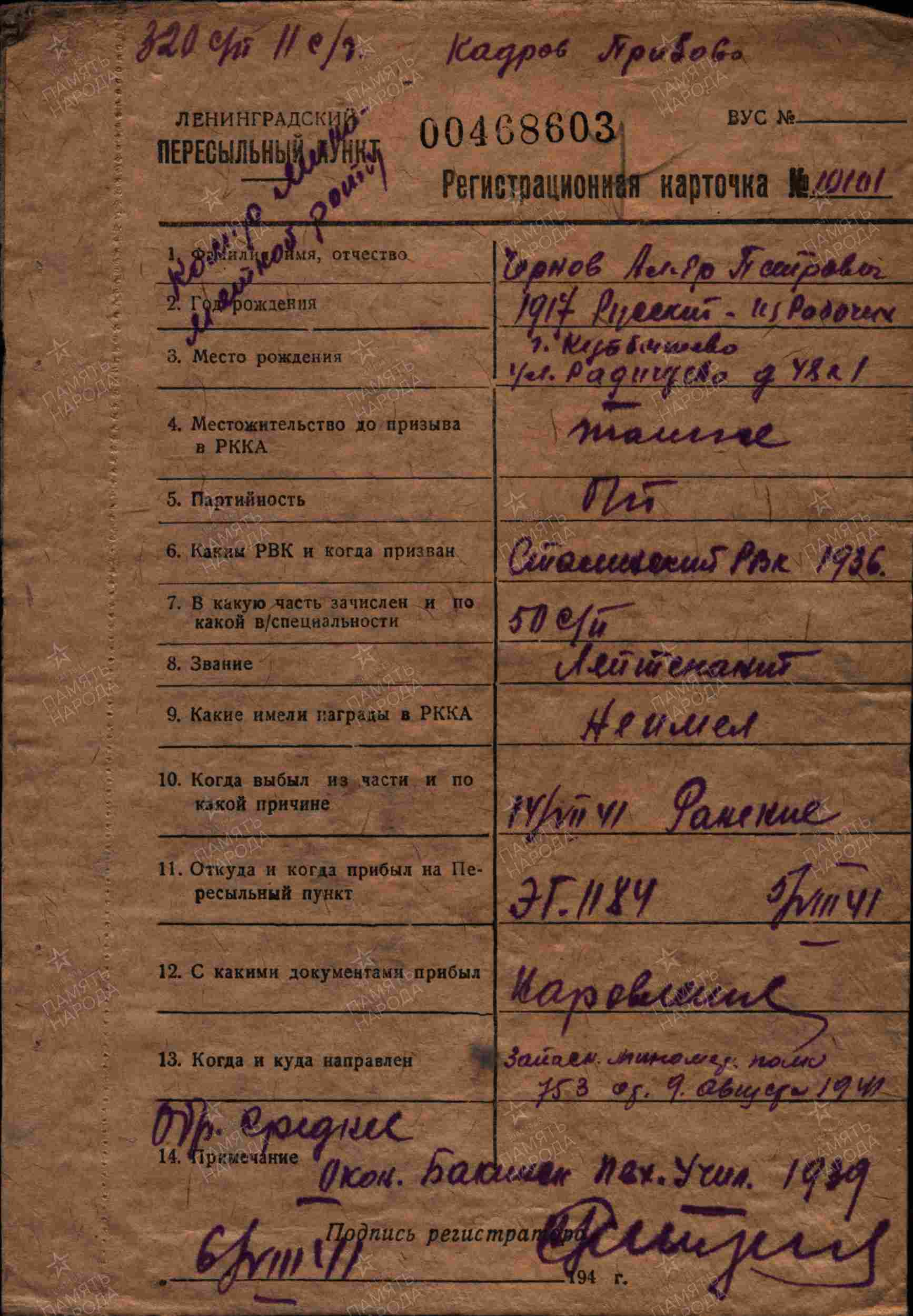 Александр Чернов родился 26 августа 1917 года. Окончил военное училище в городе Горьком (по архивным сведениям из Регистрационной карточки Ленинградского пересыльного пункта окончил Бакинское пехотное училище в 1939 году). Старший лейтенант. Служил в составе воинских частей: 657 стрелковый полк 125 стрелковой дивизии, 631 стрелковый полк 159 стрелковой дивизии, 50 стрелковый полк 39 стрелковой дивизии. 14 июля 1941 года был ранен, находился на излечении в ЭГ 1184. Весной 1944 года проходил лечение в ЭГ 1448. Награждён медалью «За оборону Ленинграда».