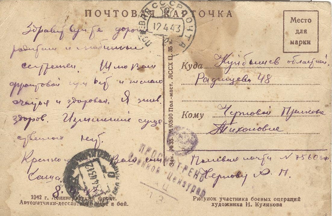 Писал открытку на имя матери, Прасковьи Тихоновны Черновой. Текст на почтовой карточке (написано почерком Александра Чернова): «Здравствуйте, дорогие родители и любимые сестрёнки. Шлю вам фронтовой привет. Желаю счастья и здоровья. Я жив, здоров. Изменений существенных нет. Крепко целую. Ваш сын Саша. 8. 4.43 г.». На почтовой карточке изображены: 1942 г., Ленинградский фронт, автоматчики-десантники идут в бой (рисунок участника боевых операций художника Н. Куликова). Стоит печать: полевая почта СССР 12443 и штамп: Просмотрено военной цензурой