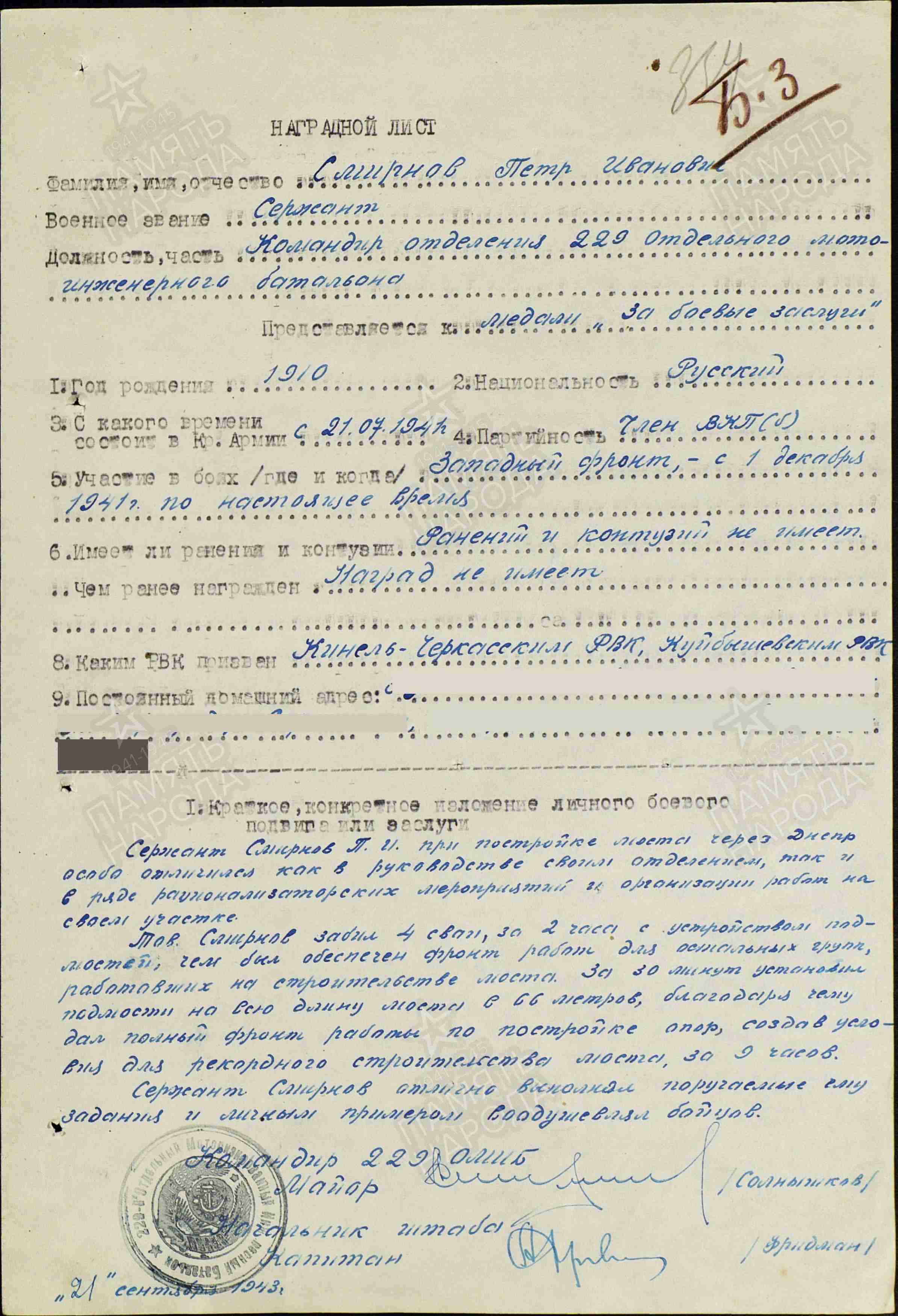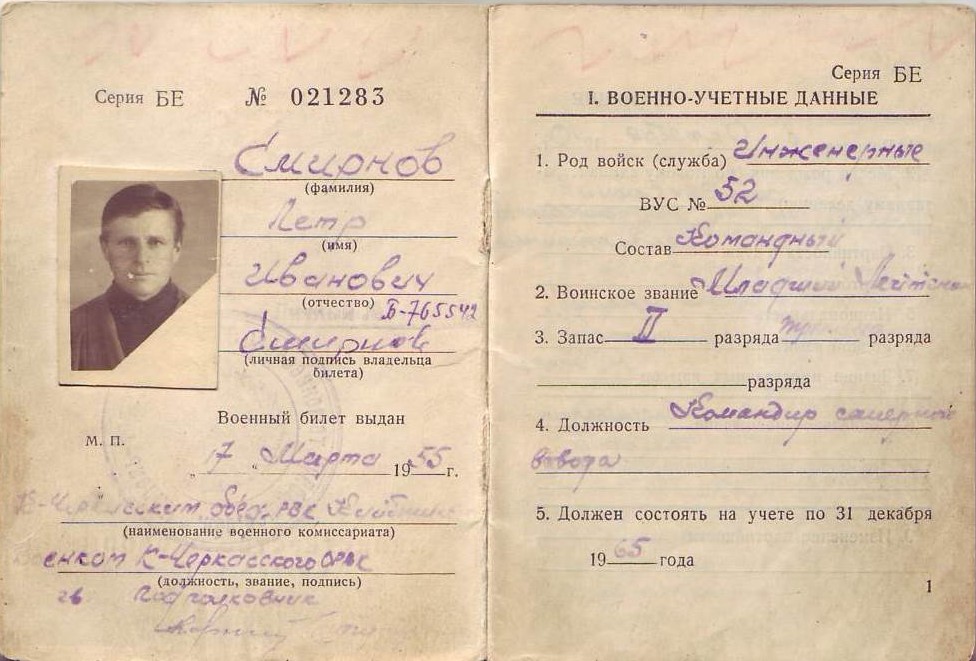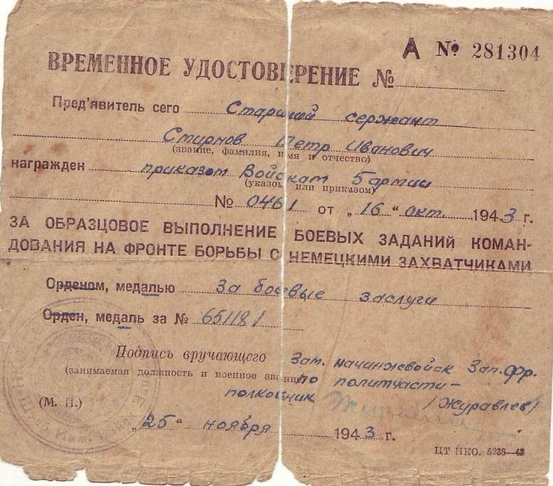 В период с июня 1941 по апрель 1945 года – помощник командира саперного взвода; с апреля 1945 года по июль 1945 года – командир саперного взвода. С июля 1941 гола по март 1942 года – 475 отд. саперный батальон 352 стрелковой дивизии, Центральный фронт. С сентября 1942 года по декабрь 1944 года – 229 отд. мото-инженерный стрелковый батальон, 2 мото-инженерной штурмовой бригады, 1-й Прибалтийский фронт. Петр Иванович Смирнов умер в апреле 1978 года.