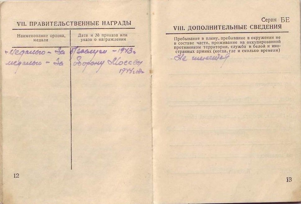 Награжден медалями «За боевые заслуги», «За оборону Москвы».