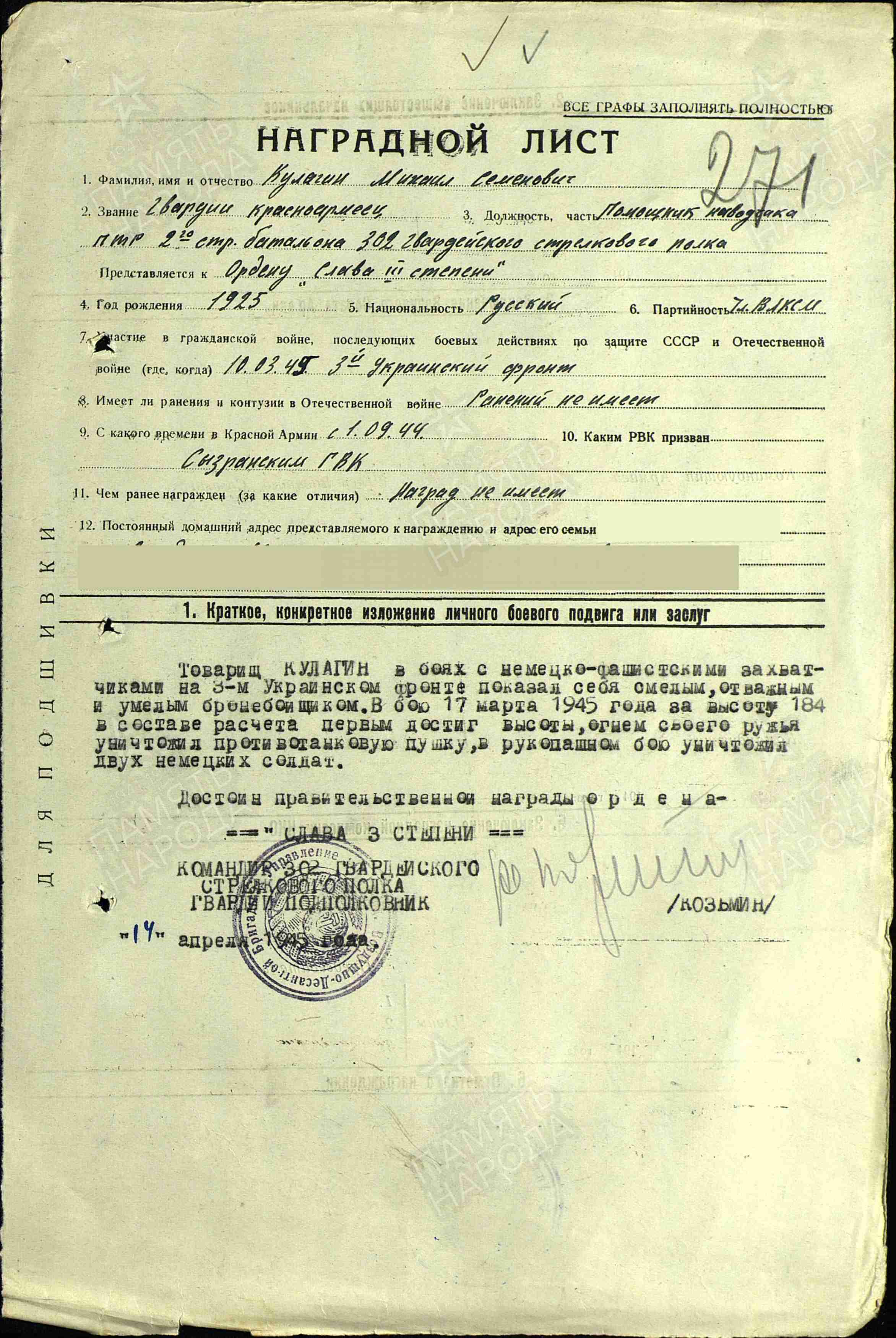 Михаил Кулагин родился 4 ноября 1925 года в селе Елшанка Теренгульского района Ульяновской области. В Красную Армию был призван 3 января 1943 года, а присягу рядовой Кулагин принял 23 февраля 1943 года. Окончив 3-е Куйбышевское пехотное училище,был направлен в Подмосковье в десантные войска. Воевал на Карельском и 3-м Украинском фронтах. Участвовал в боевых действиях, освобождал города и сёла, был ранен.