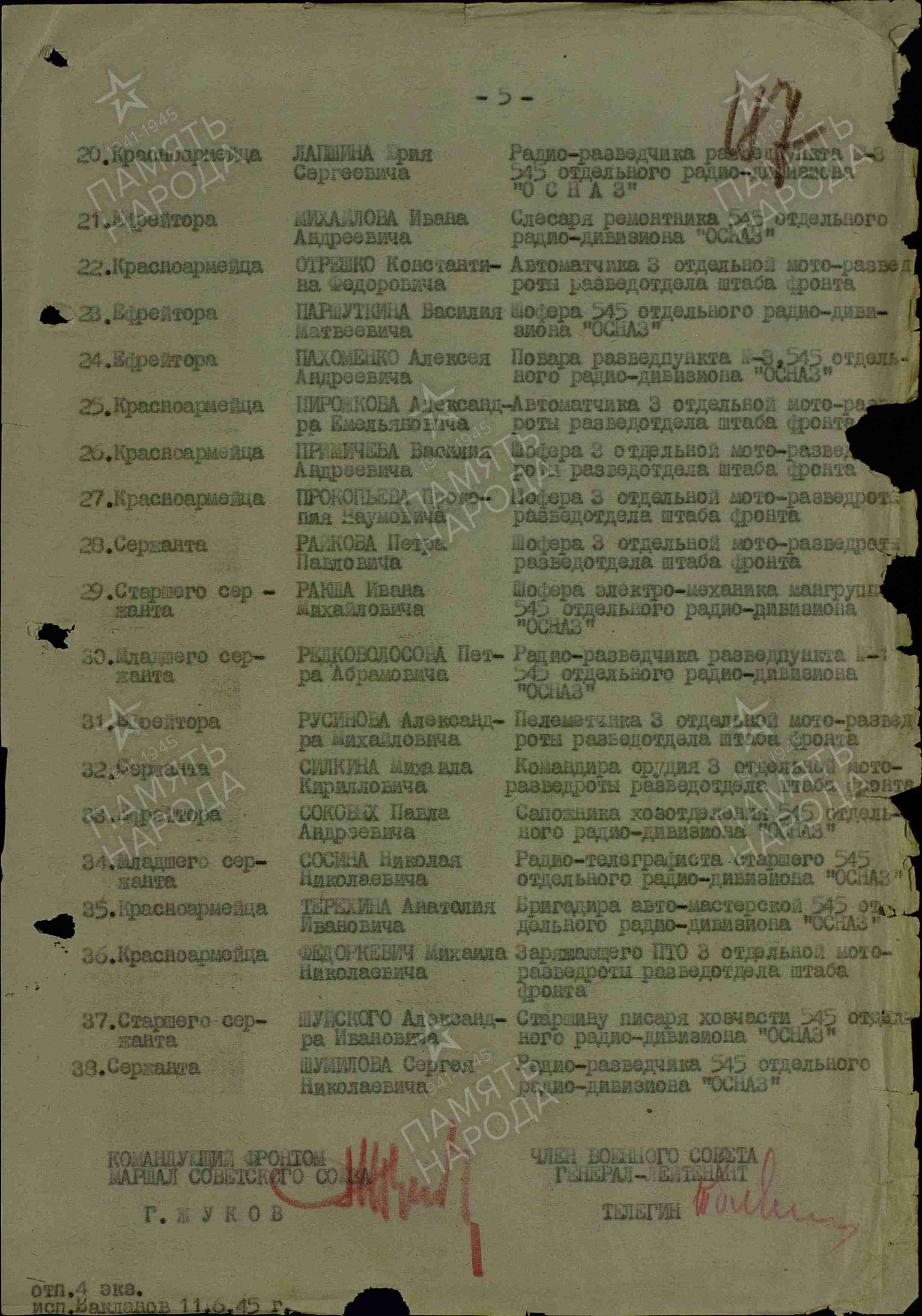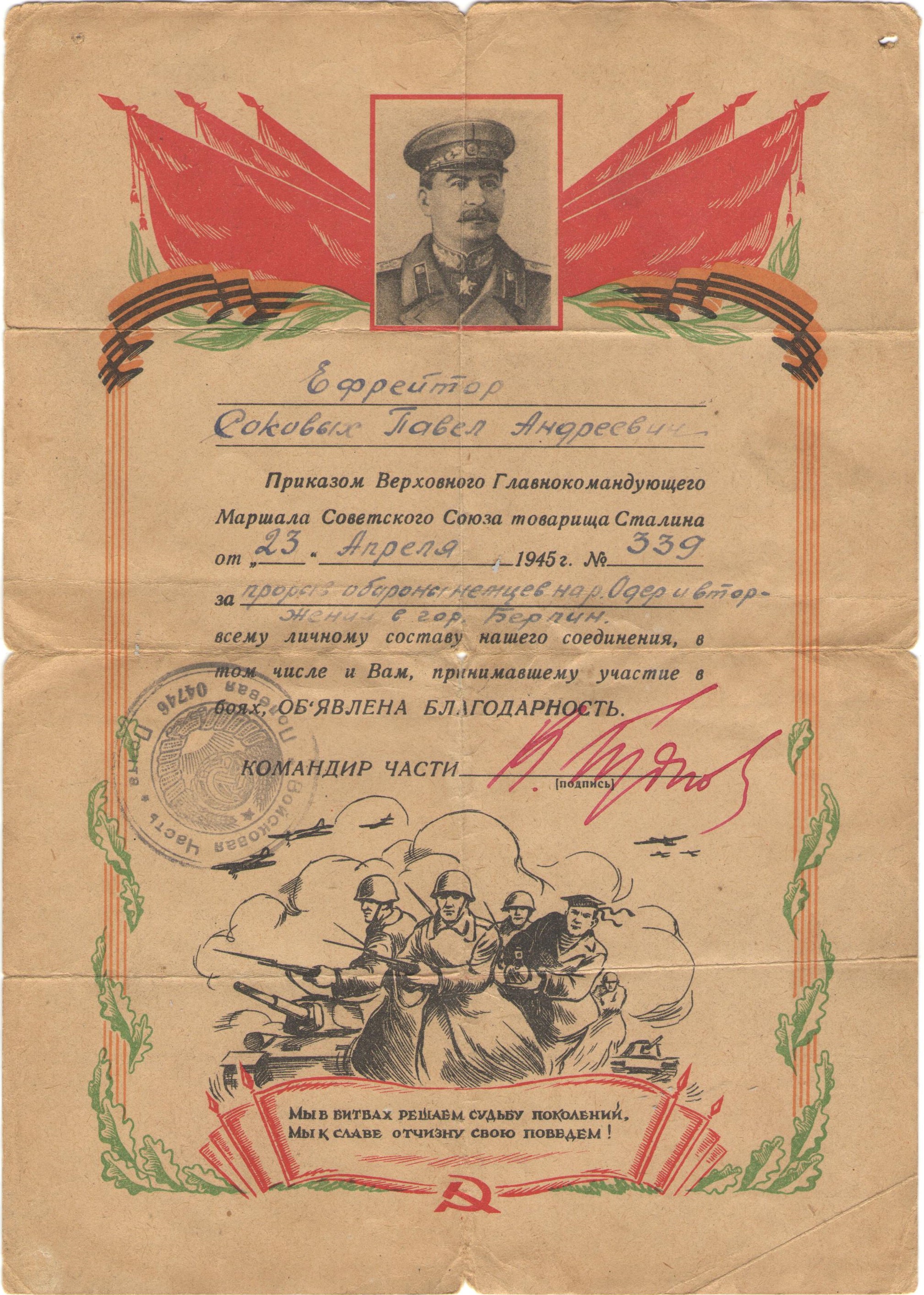 В семейном архиве сохранился документ военной эпохи: Благодарность ефрейтору Соковых Павлу Андреевичу от 23 апреля 1945 года за прорыв обороны немцев на р. Одер и вторжение в город Берлин. Павел Андреевич умер в мирное время в 1971 году.