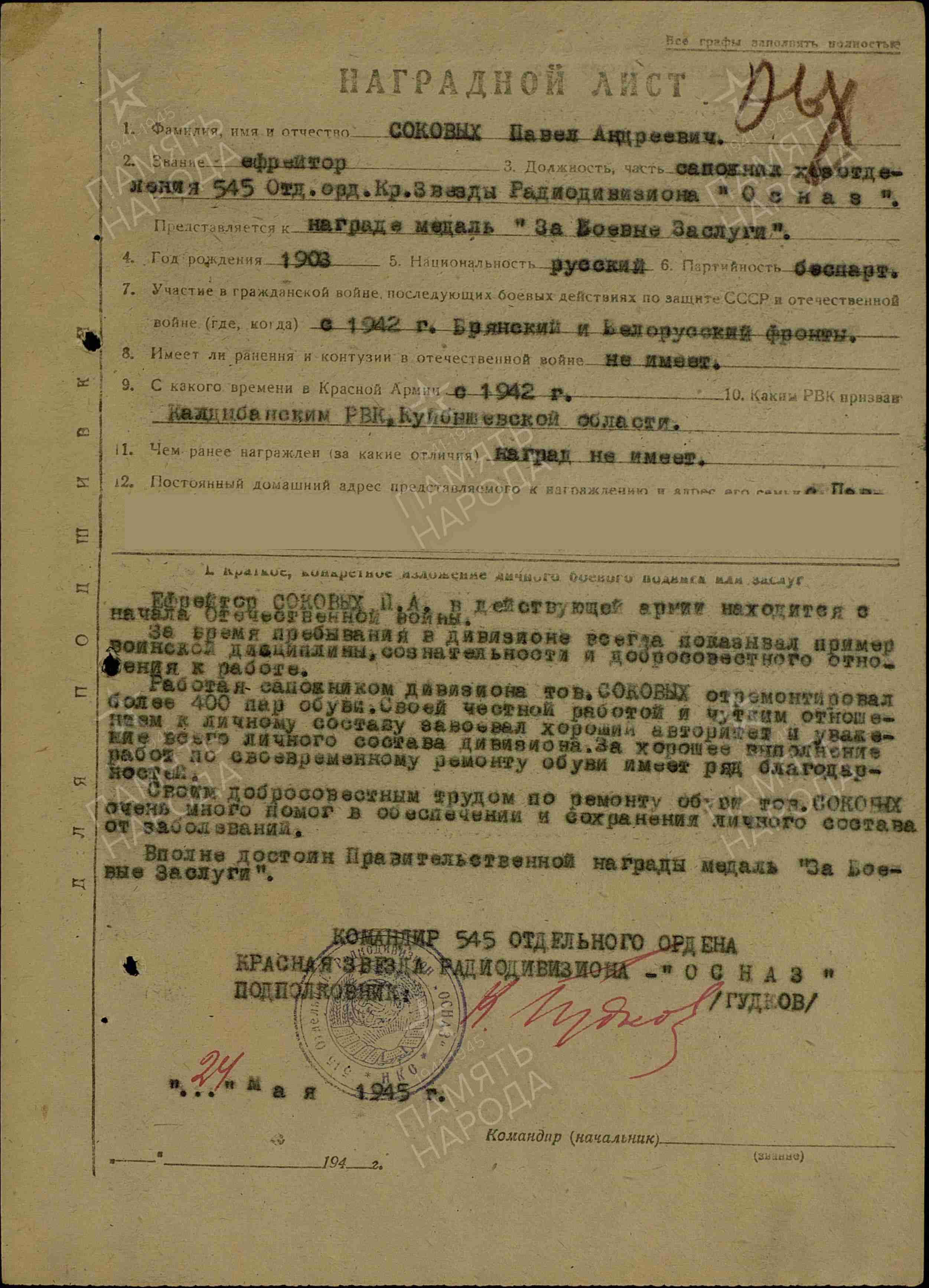 Информация из Наградного листа от 24 мая 1945 года: «Ефрейтор Соковых П.А. в действующей армии находится с начала Отечественной войны. За время пребывания в дивизионе всегда показывал пример воинской дисциплины, сознательности и добросовестного отношения к работе. Работая сапожником дивизиона, товарищ Соковых отремонтировал более 400 пар обуви. Своей честной работы и чутким отношением к личному составу завоевал хороший авторитет и уважение всего личного состава дивизиона. За хорошее выполнение работ по своевременному ремонту обуви имеет ряд благодарностей. Своим добросовестным трудом по ремонту обуви товарищ Соковых очень много помог в обеспечении и сохранения личного состава от заболевания».