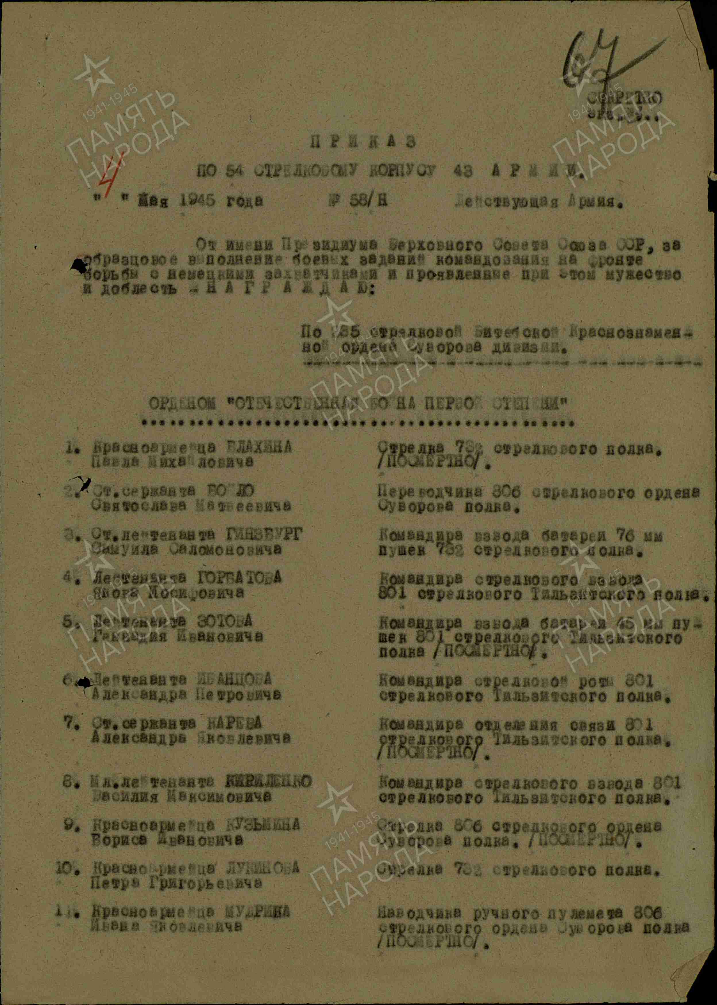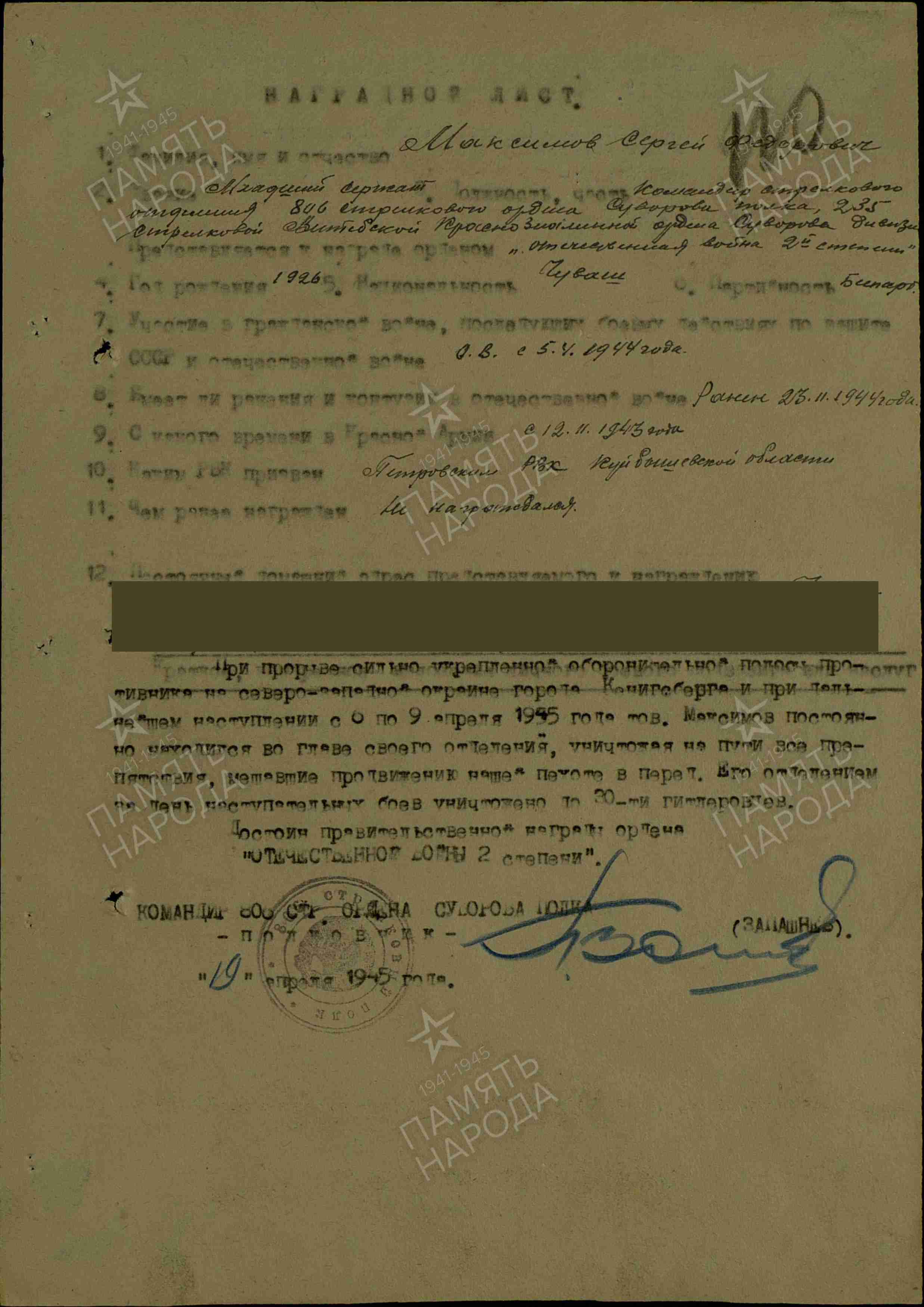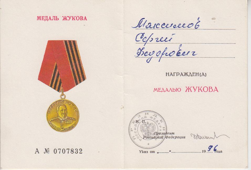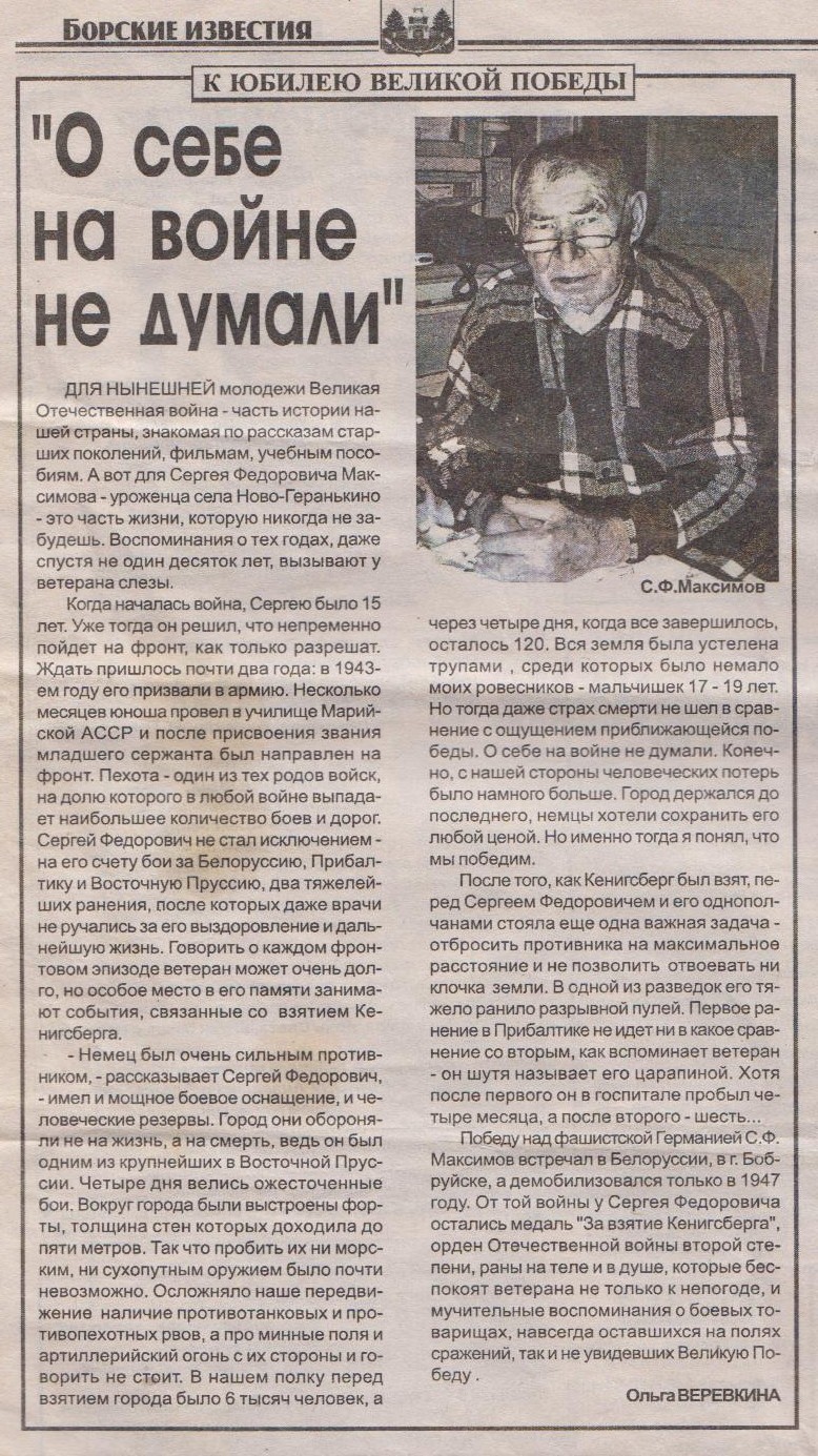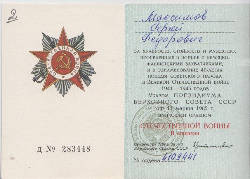 Информация из Наградного листа от 19.04.1945 года: «При прорыве сильно укрепленной оборонительной полосы противника на северо-западной окраине города Кенигсберга и при дальнейшем наступлении с 6 по 9 апреля 1945 года тов. Максимов постоянно находился во главе своего отделения, уничтожая на пути все препятствия, мешавшие продвижению нашей пехоте вперед. Его отделением за день наступательных боев уничтожено до 30-ти гитлеровцев. Достоин правительственной награды ордена «Отечественной войны II степени».