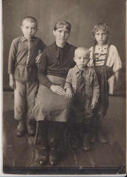1913 года рождения. Труженица тыла. В нашем распоряжении оказалась ее фотография с детьми (1944 г.), на обороте которой надпись: «Милому своему муженечку Шуре шлю свои личности, какие мы были и какие есть сейчас».